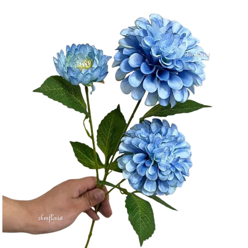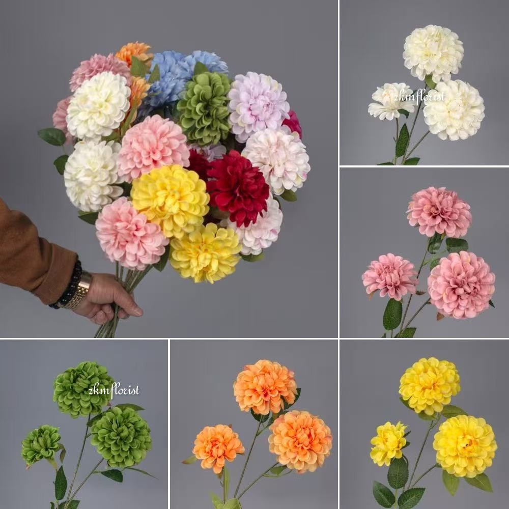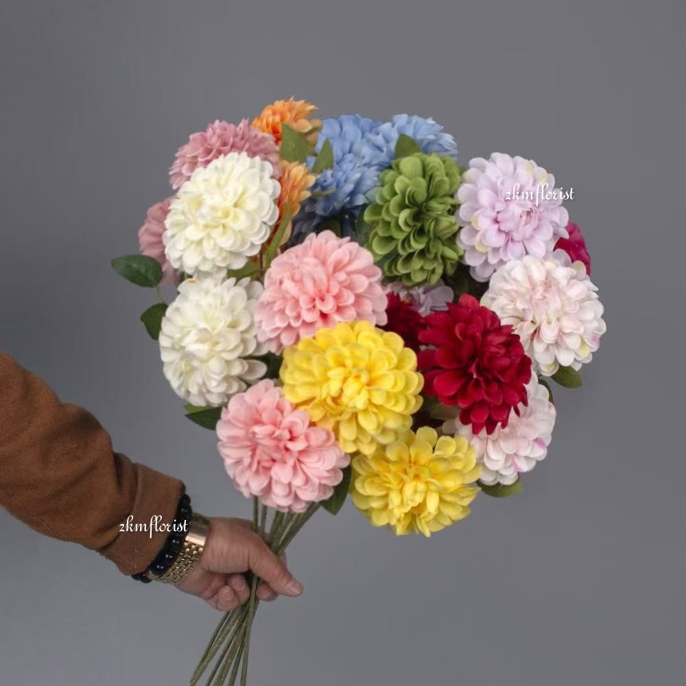(3 HEADS) BALL DAHLIA ARTIFICIAL Chrysanthemum Daisy Bellis Pompom Ping Pong Fake Flower Bunga Hiasan Rose Hydrangea