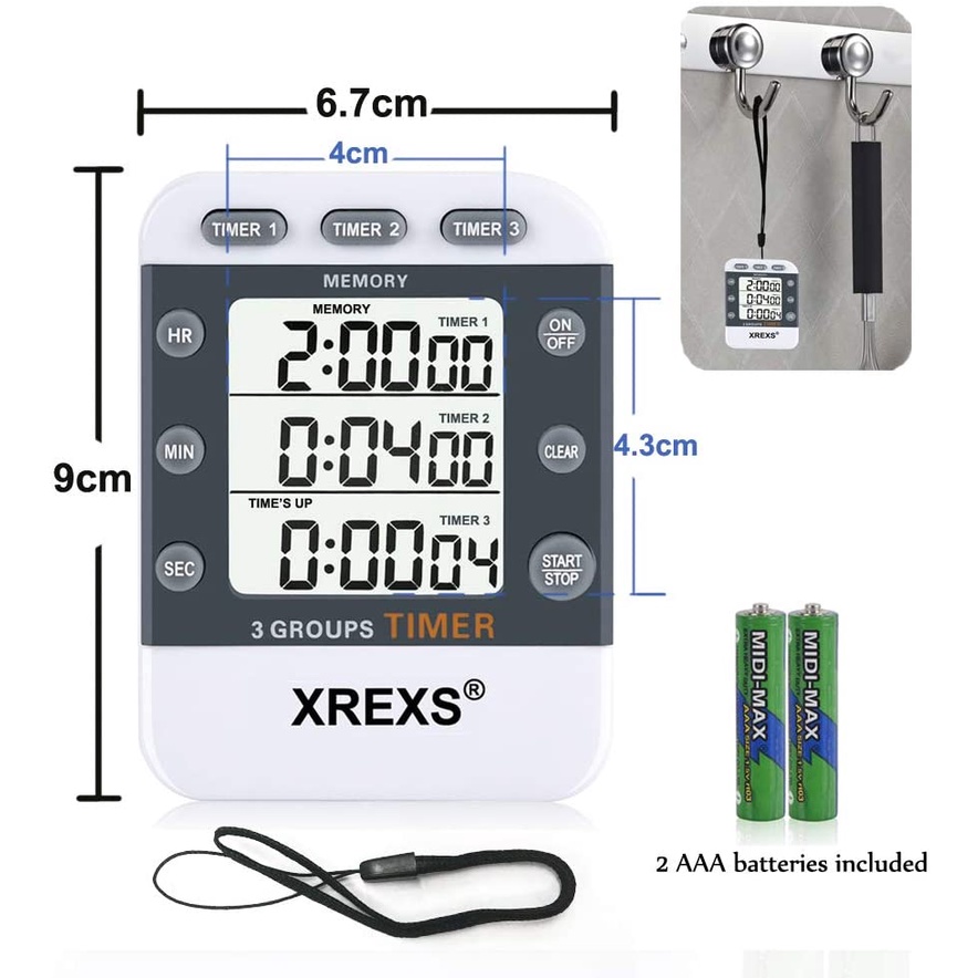 (No Battery) XREXS 3 Channels Count UP/Down Cooking Timer, Stopwatch, Large Display, Adjustable Volume Alarm Memory Time