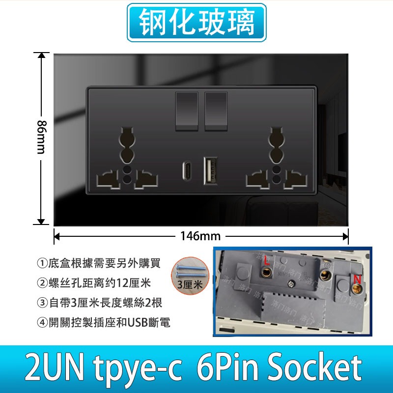 (Tempered Glass) Household 1/2/3/4gang 1 2 3way Light Switch (LED Indicator)/13A Wall Power USB+C Socket/3-pin 5-pin Universal Wall Socket, 15A 20A 45A Air Conditioner/Heater Switc