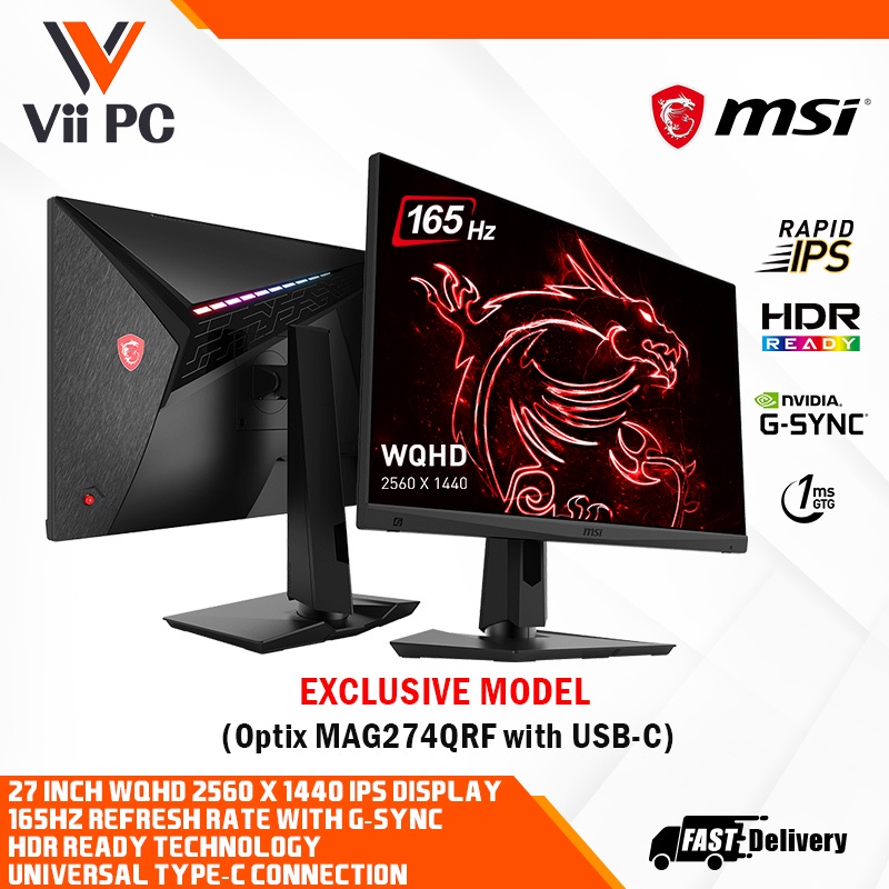 MSI Optix MAG274QRF GAMING MONITOR 27inch, 165Hz, Rapid IPS WQHD 1ms G-Sync HDR Ready, USB C