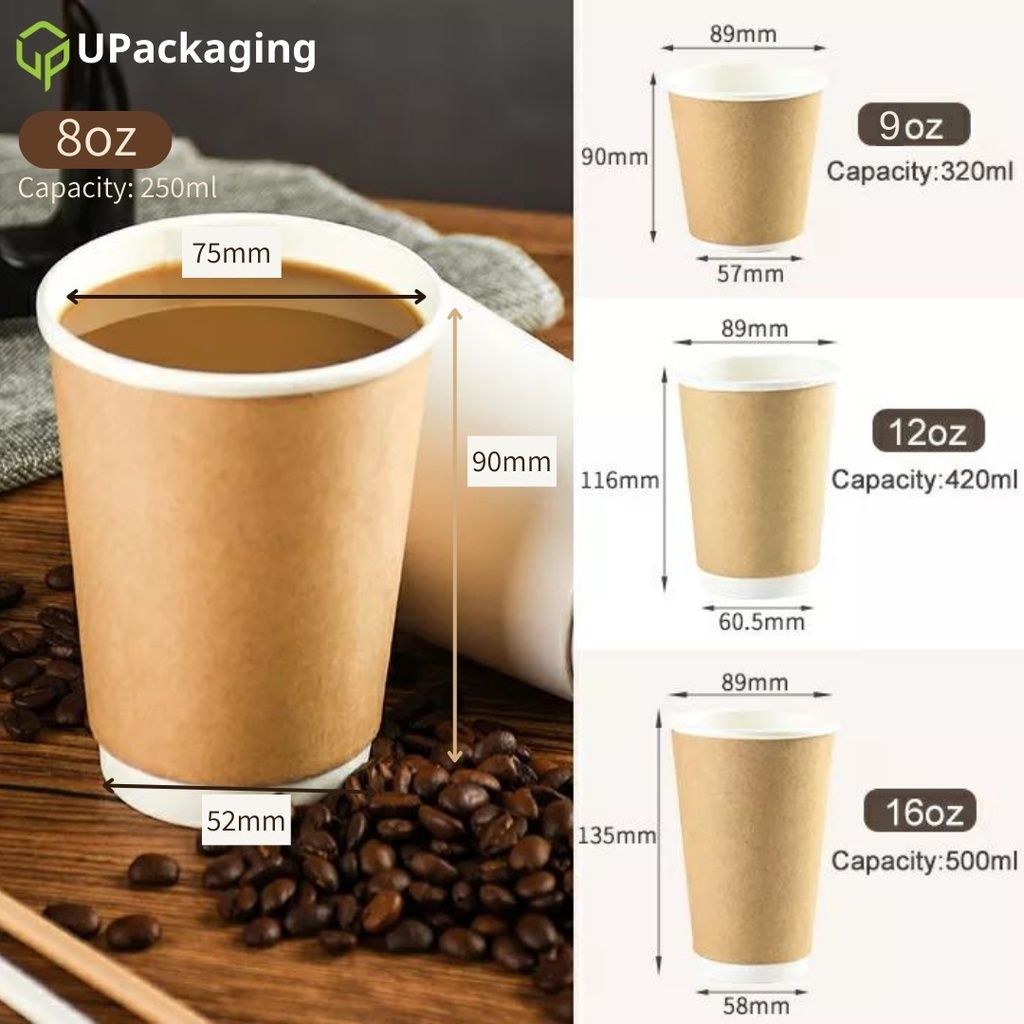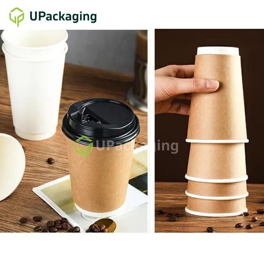 [50 Pcs] PAPER DOUBLE WALL CUP Disposable 8oz/ 9oz/ 12oz/ 16oz Lids Hot Cups Coffee White Brown Kraft