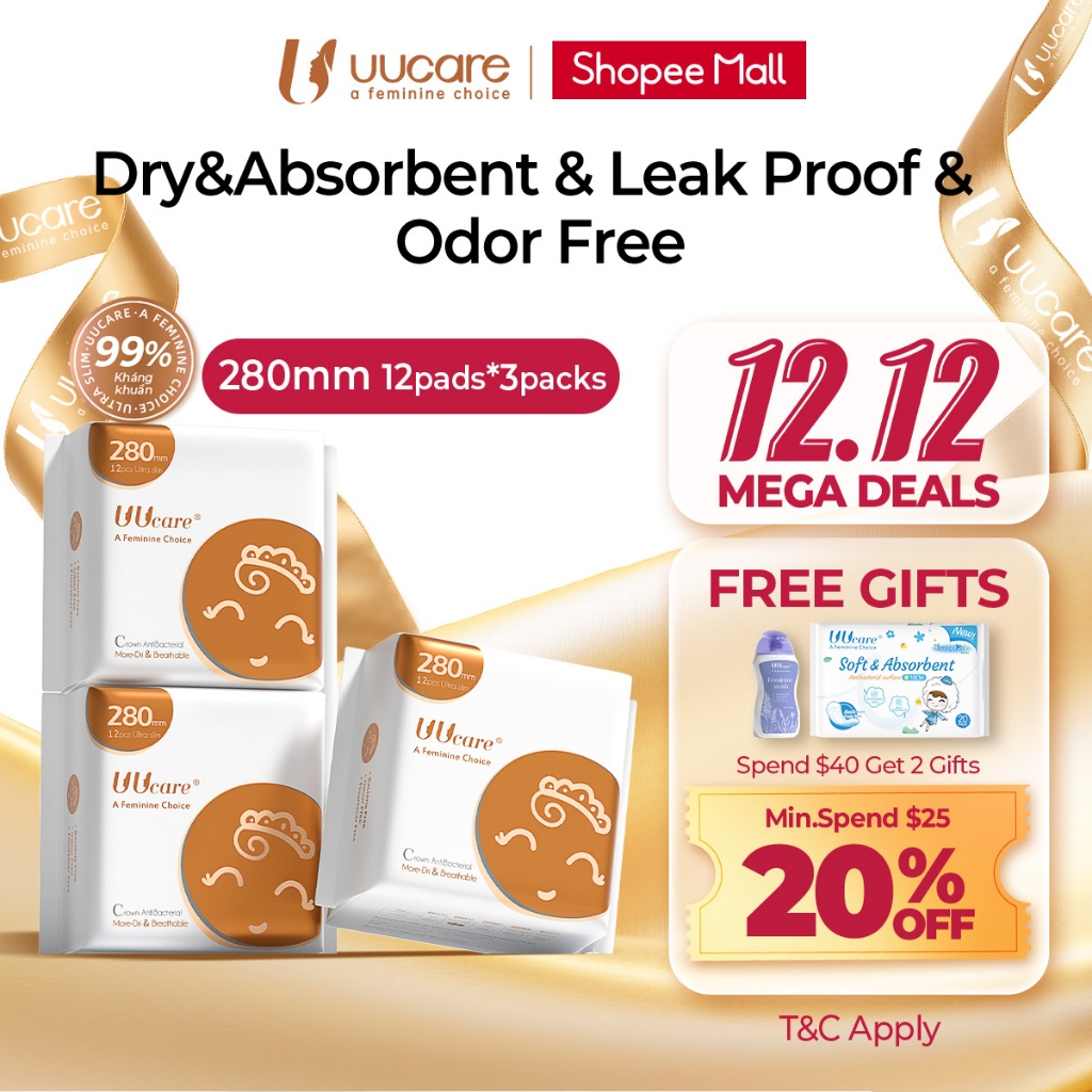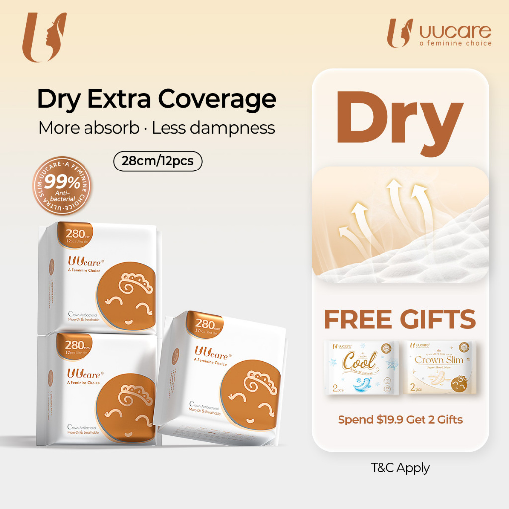 [Bundle of 3]UUcare Crown Sanitary Pads 28cm 12pads Antibacterial Instantly Absorb Ultra-slim Soft Breathable