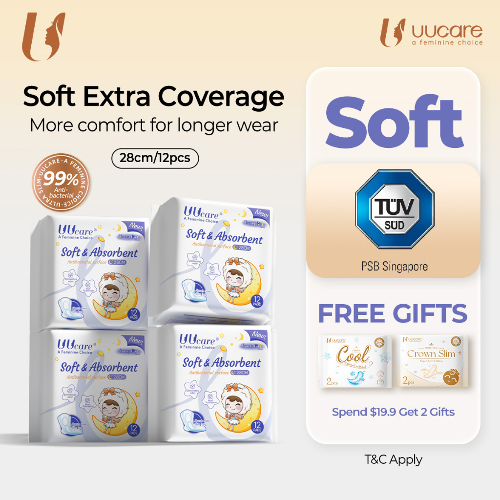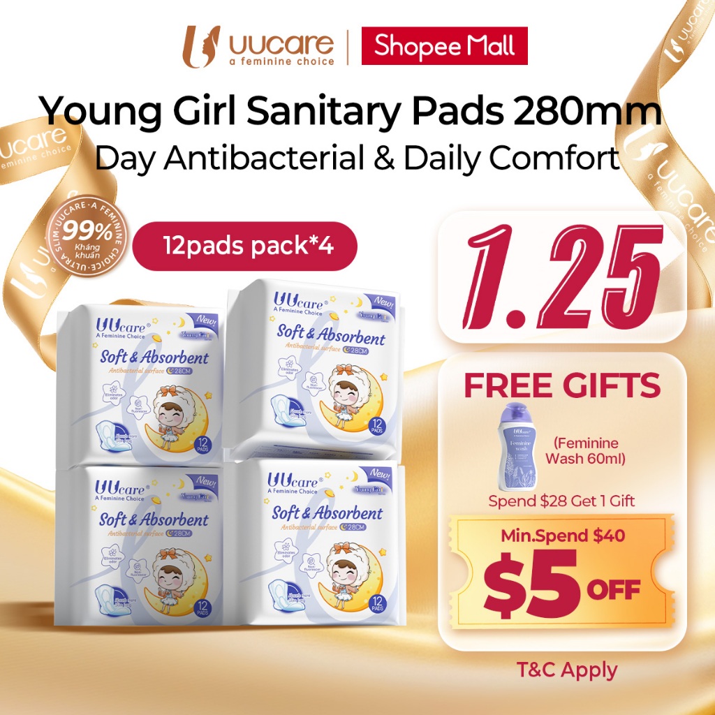 [Bundle of 4]UUcare Young Girl Sanitary Pads 28cm 12pads Antibacterial Dry Breathable Instant Absorption Night