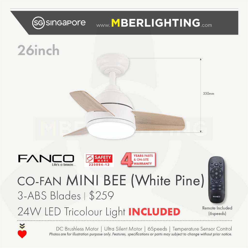[SG Stock] FANCO Mini Bee 26" DC Ceiling Fan with 3Tone 24W LED Light & Remote [For Small AreasR