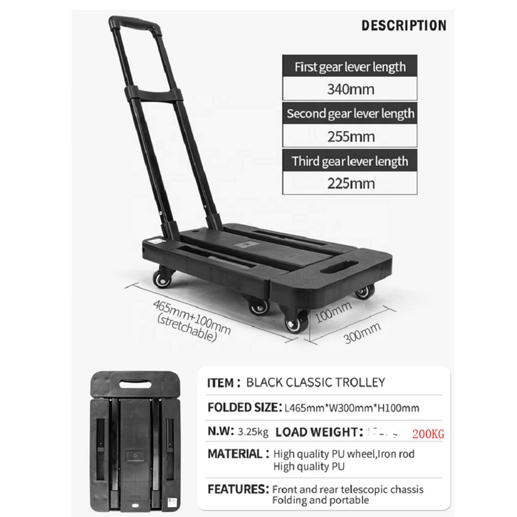 {SG Ready Stock} Foldable trolley Universal wheel Platform car The six round Portable 100kg (black) With Mute Wheels