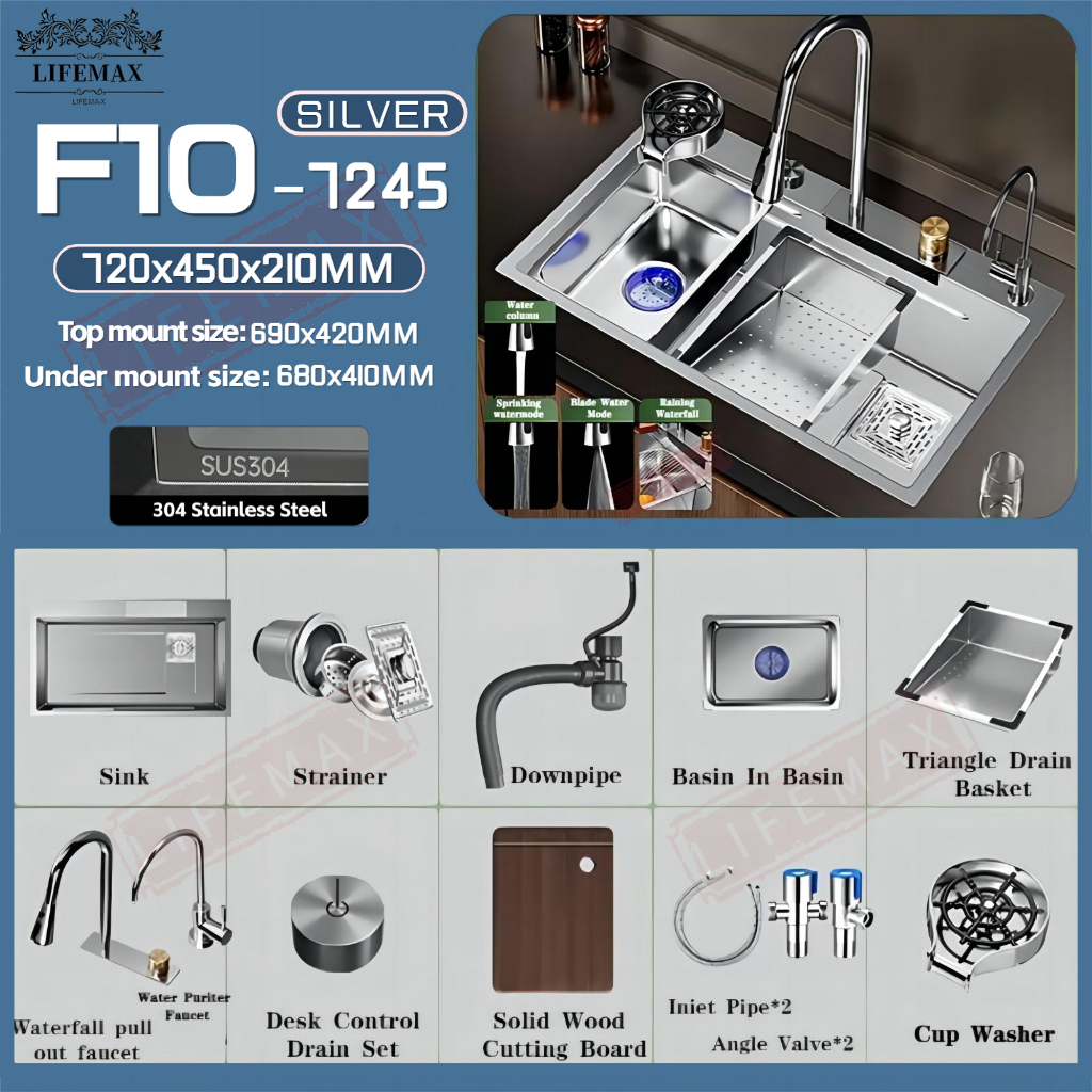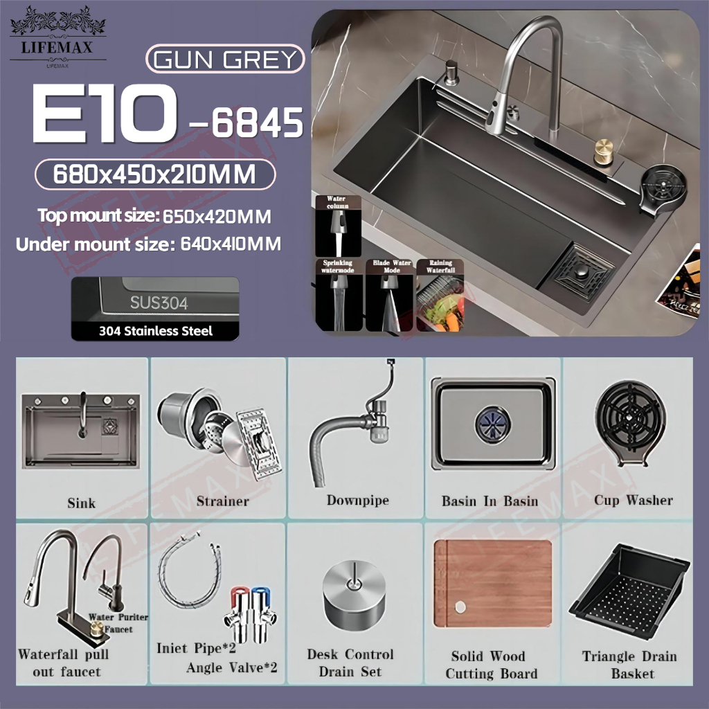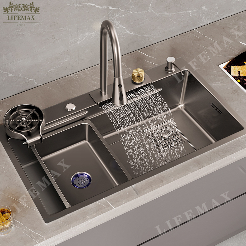 [SG Seller]Waterfall Nano Kitchen Sink 304 Stainless Steel Single Basin Bowl Tank Pullout Faucet Tap(3 Colors Optional)