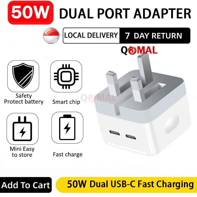 [SG stock] 2 Ports USB C 50W Fast Charging 20W PD Power Adapter Dual Type C Charger Travel UK Charging 1M/2M Cable