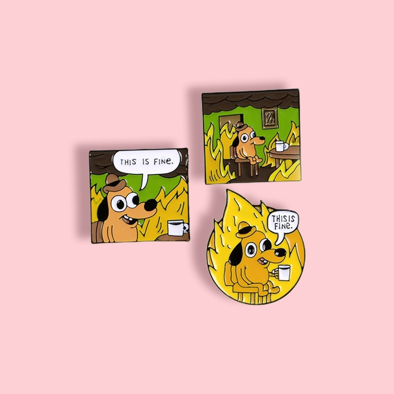 "This Is Fine" Dog Meme Pins Funny Animal Comics Enamel Pins Cartoon Brooches for Women Men Lapel Bag Badges Jewelry