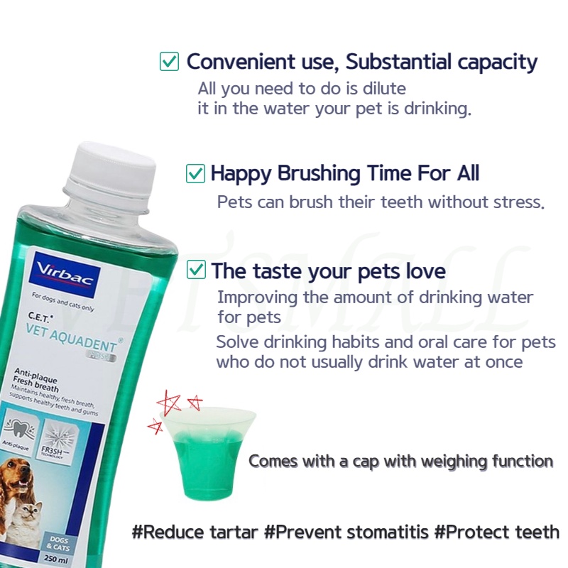 [Virbac] Virbac cet C.E.T. Vet Aquadent Fresh Dental Solution For Dog & Cat 250ml, Drinking Toothpaste For Pets, Vet Aquadent FR3SH Dogs & Cats
