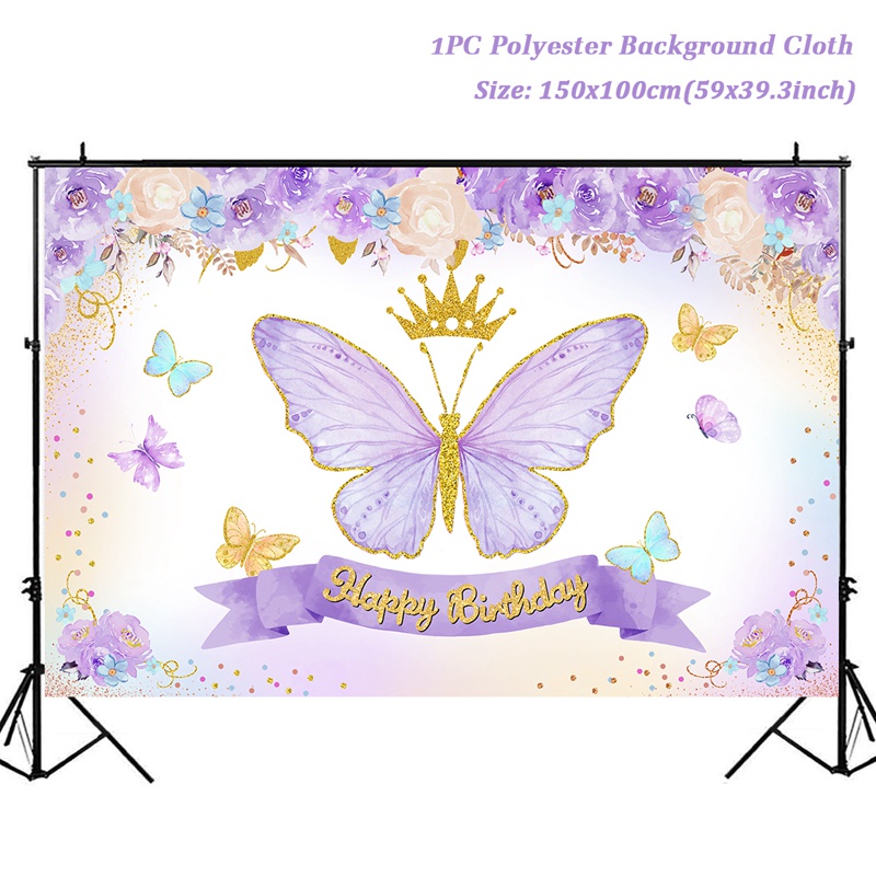 1*1.5m Polyester Purple Butterfly Birthday Backdrop Butterfly Background Banner Flowers Fairy Butterfly Wedding Birthday Party Decor Kids Girls Baby Shower