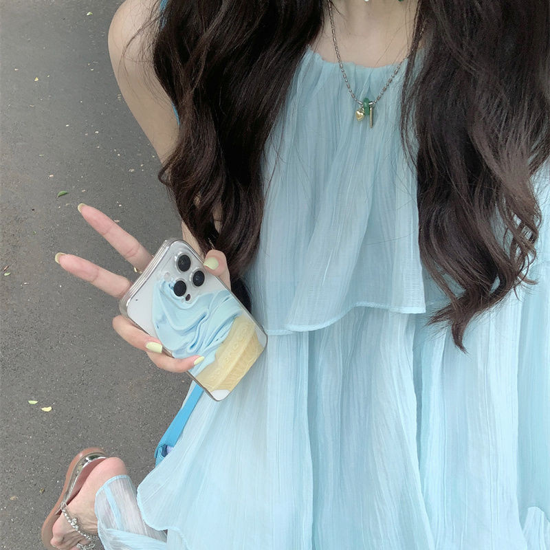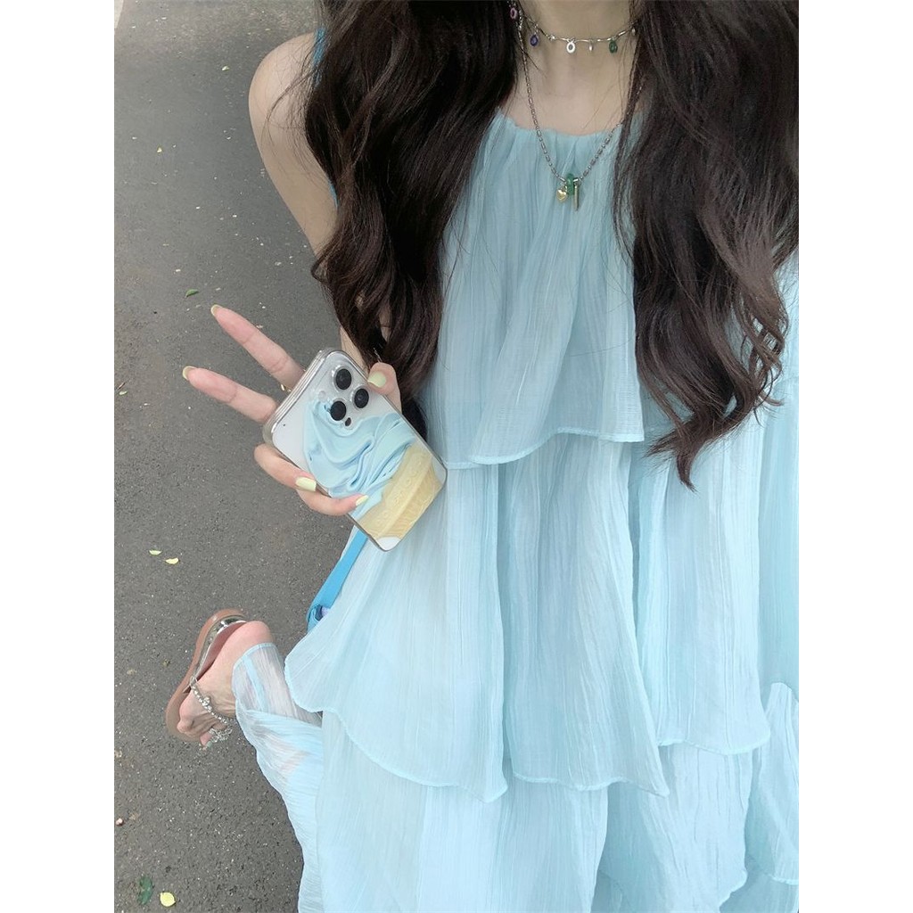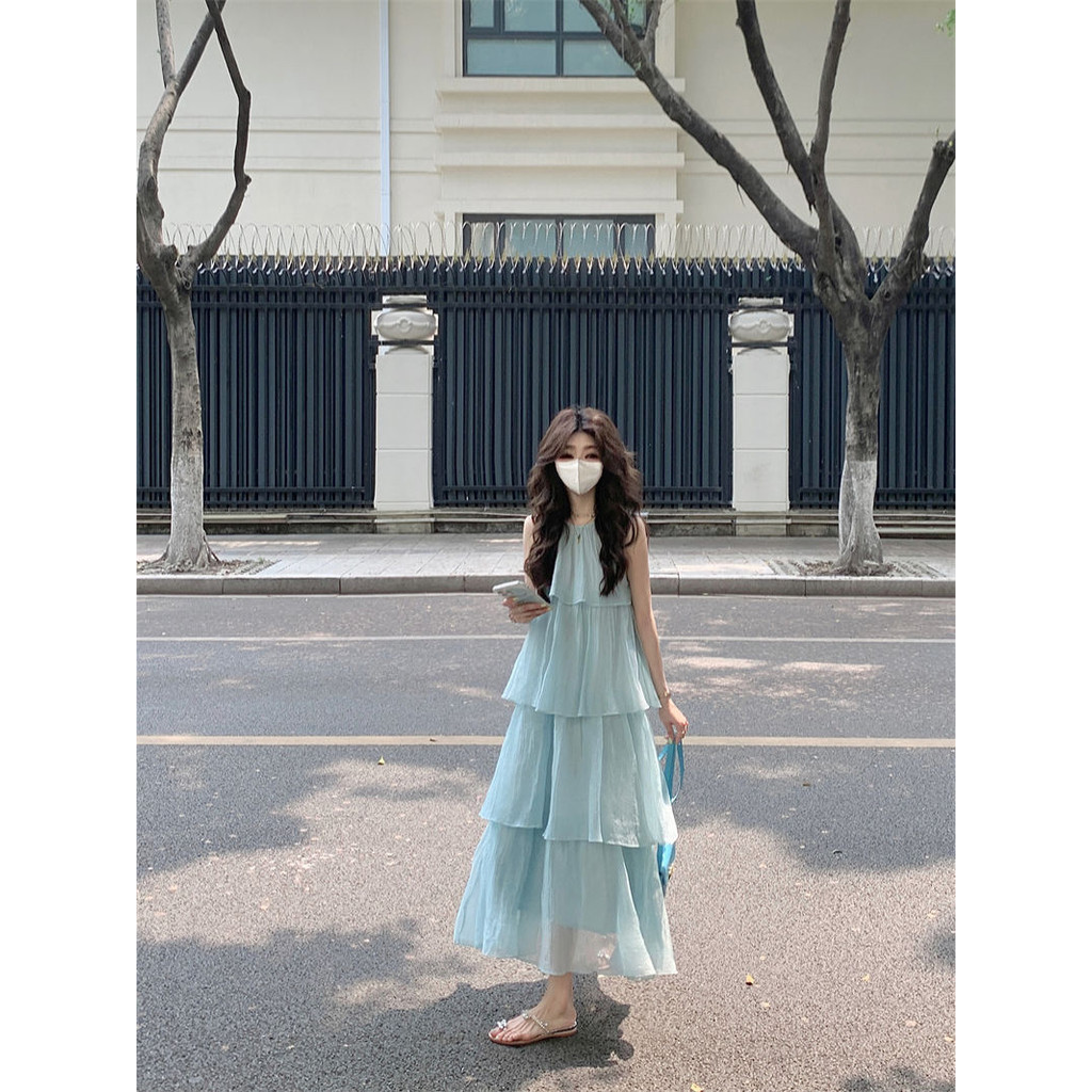 Light Style Baby Blue One-Piece Dress Youthful Sweet Summer Two-Piece Dress for Women Sleeveless A-Line Dress