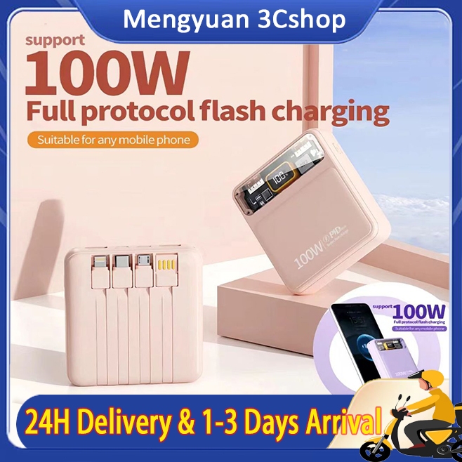 100W Super Fast Charging 20000mah Mini Power Bank Built-in 4 Cables Digital Display Powerbank Portable External Battery