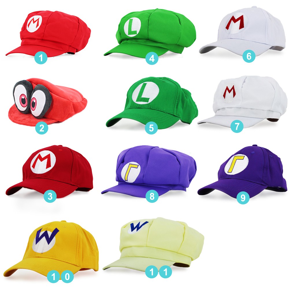 11Style Anime Super Mario Bros. Mario Hat Cap Luigi Bros Letter Printed Cosplay Cartoon Baseball Costume for Adult Hats Waluigi Wario Odyssey Cappy 3D Hat