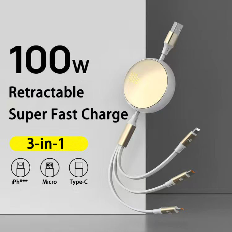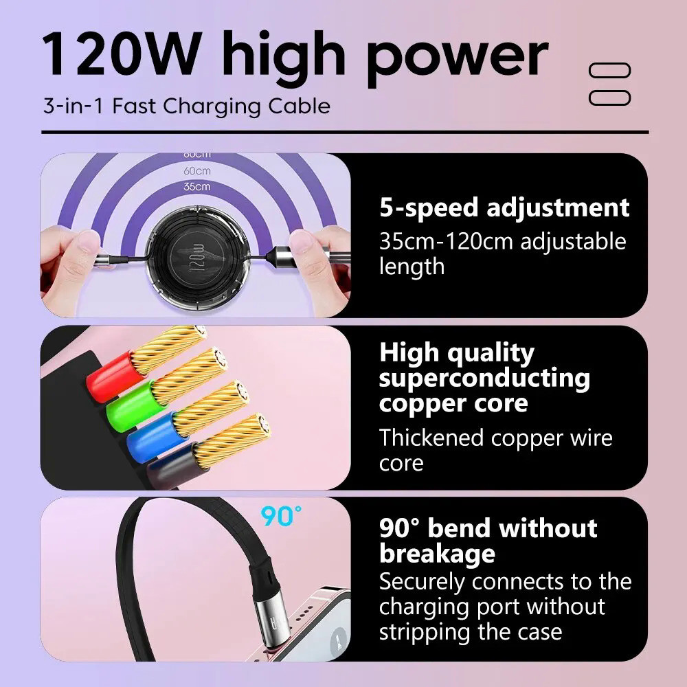 120W 3 in 1 Retractable Fast Charging Cable Micro USB Type C 6A 3in1 Mobile phone Charge Wire Quick Charger Data Cable