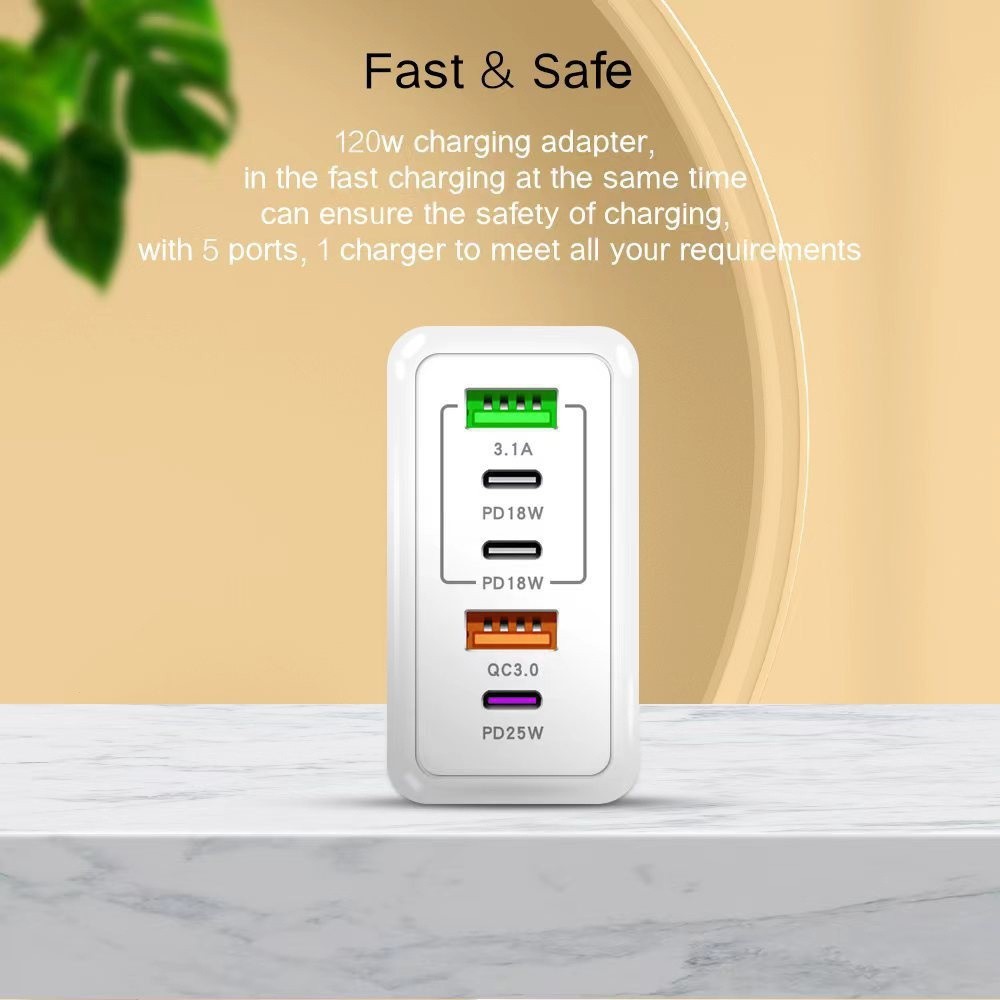 120W 5Port Fast Charger USB Type C PD Fast Charging 3.0 Adapter For Phones Quick Charger