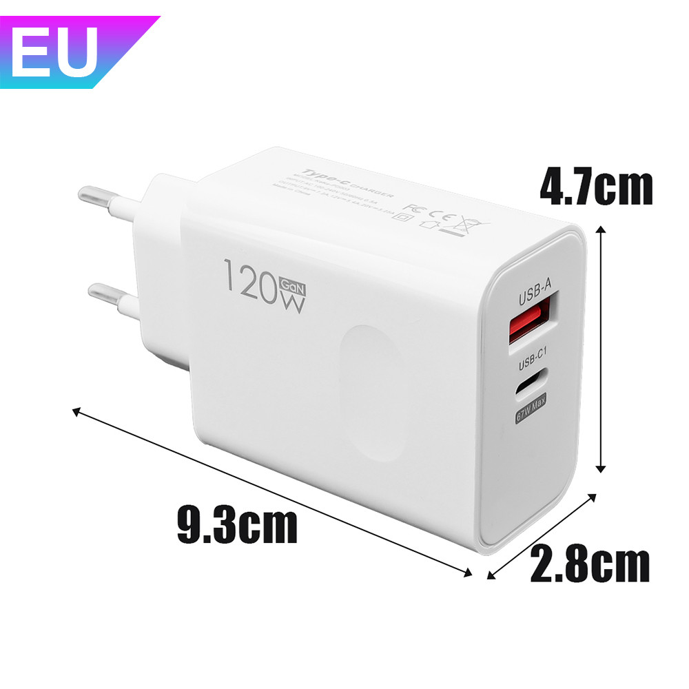 120W USB-C SB-A Super Fast Charger - EU, US, UK - Travel Universal Phone Charging Set - 2-Port Wall Charger Plug With Cable - PD67W QC3.0 Fast Charging Block