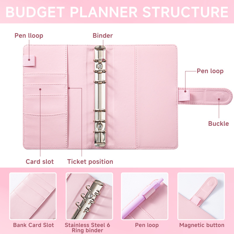1pc A6 Binder Bag with Leather Binder Cover, 6-Ring Built-in Binder, with Cash Envelope, Money-Saving Binder