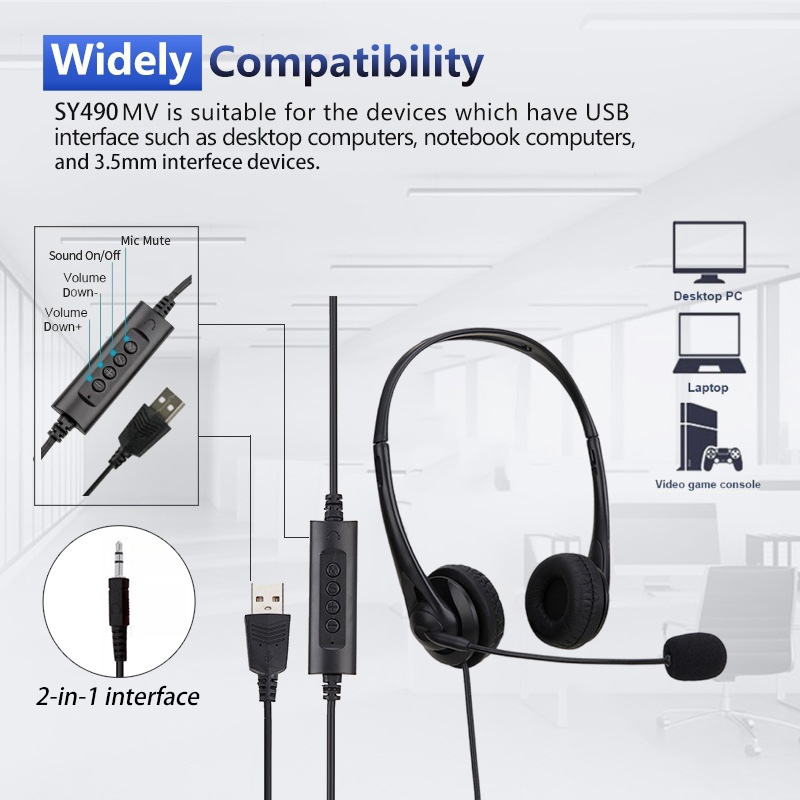 2-in-1 Wired Stereo Headset 3.5mm&USB Headworn Wired Earphones Noise-Cancelling Microphone