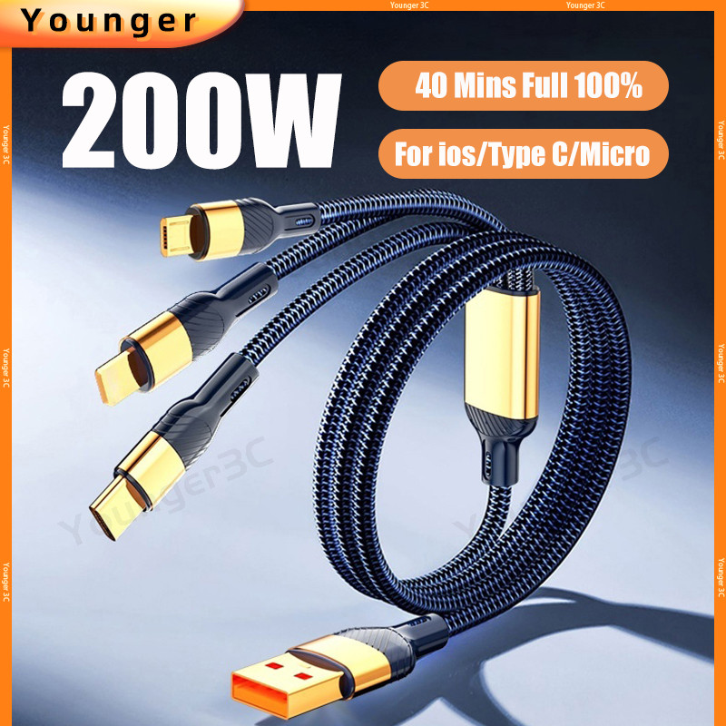 200W Zinc Alloy Super Fast Charging Cable 3 In 1 Nylon Weaving Charger Cord 3 In 1 Flash Charging Data Cable For ios Type C Micro