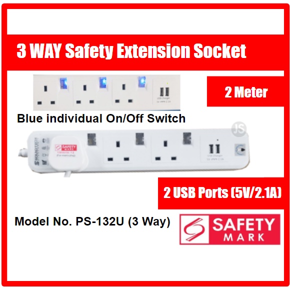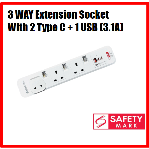 3 Way Extension Socket with 2 USB Ports (5V/2.1A)/ with 2 Type C + 1 USB & Singapore Safety Mark (2 Meter)