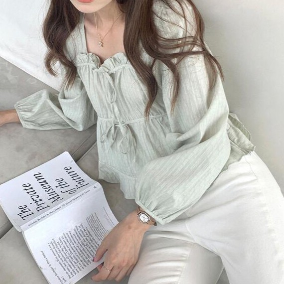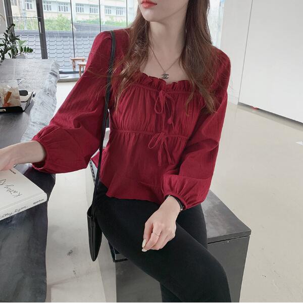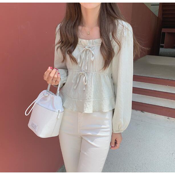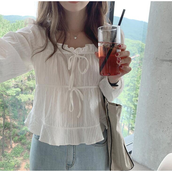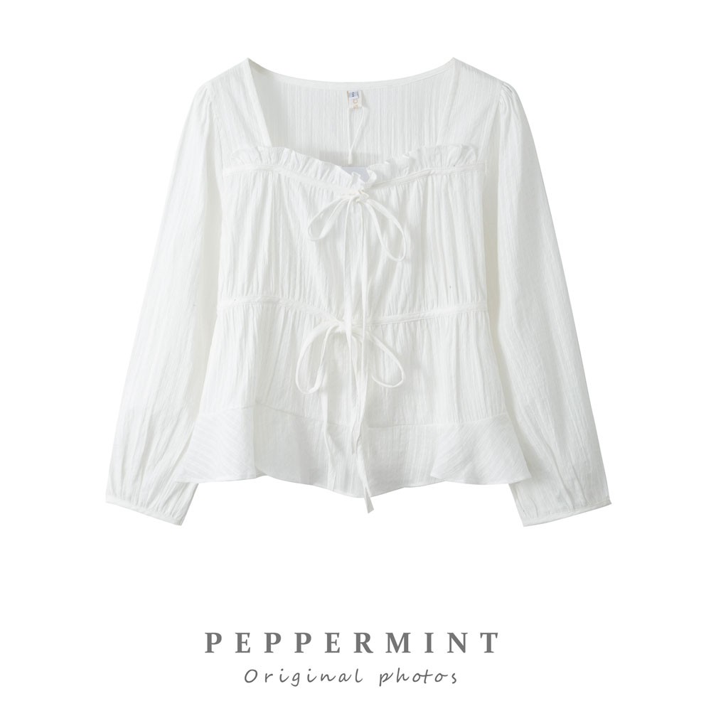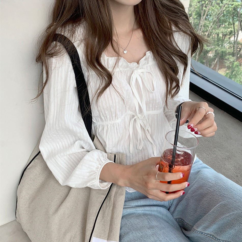 36159 Sweet Cute Lace-Up Short Jacquard Long Sleeve Shirt