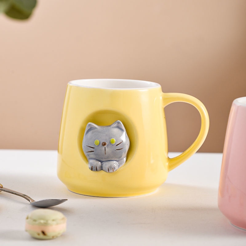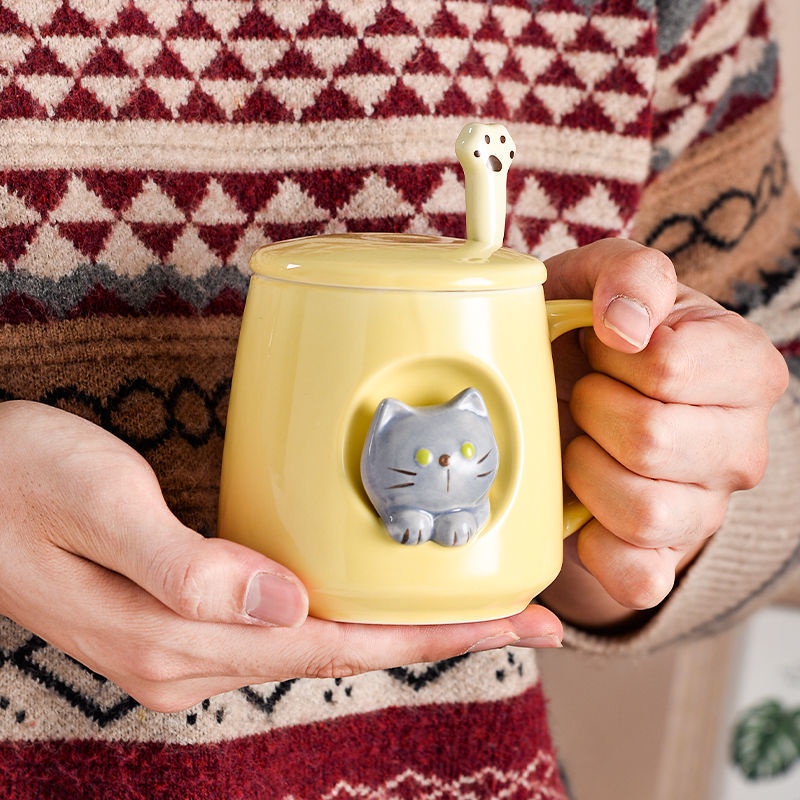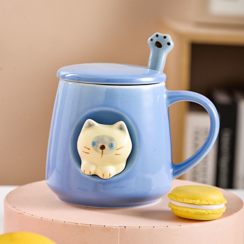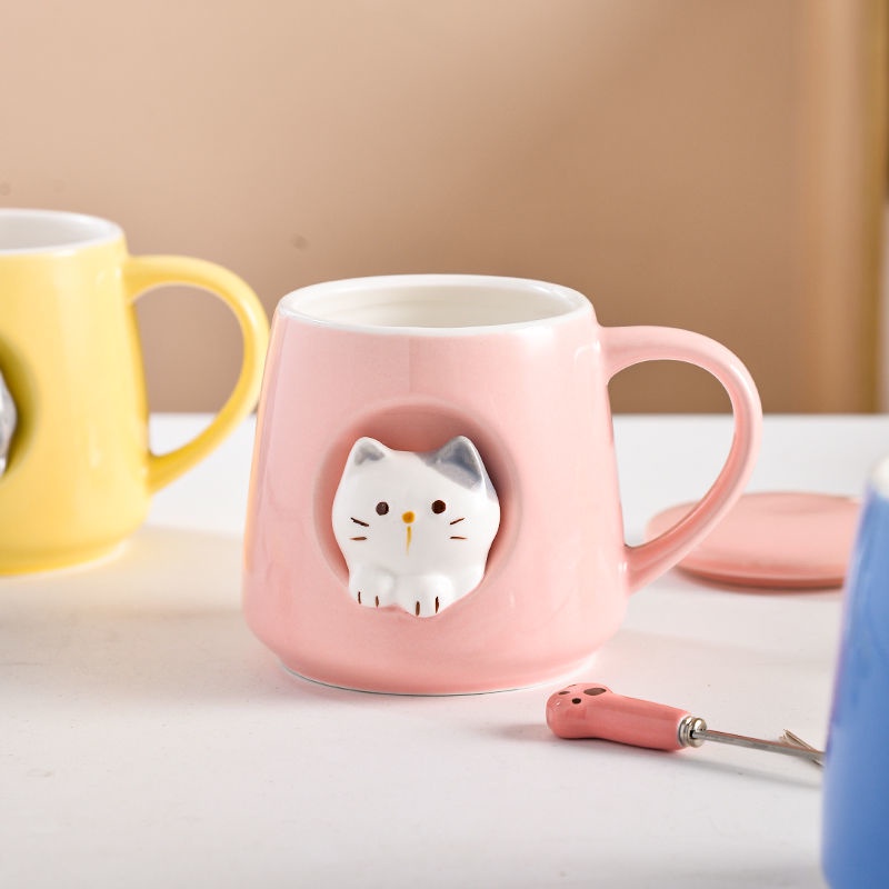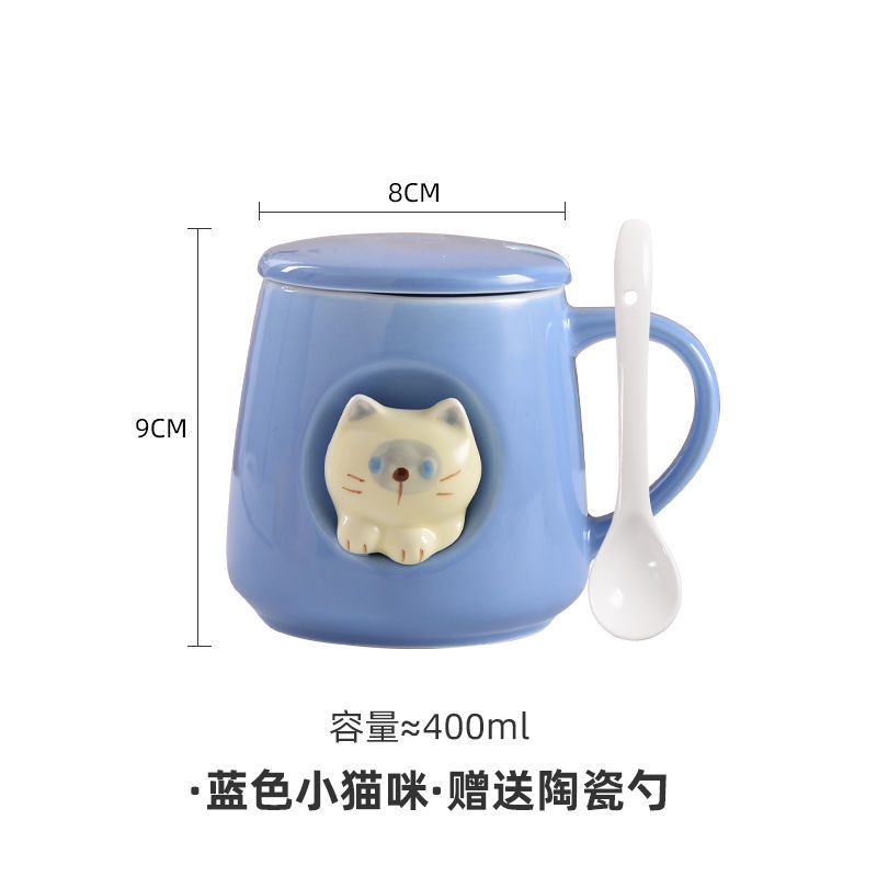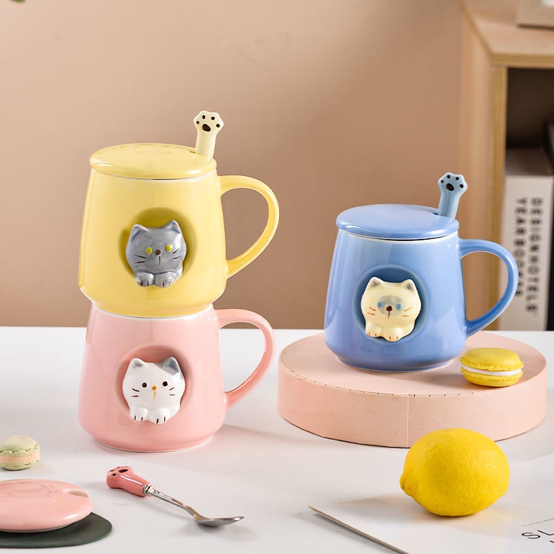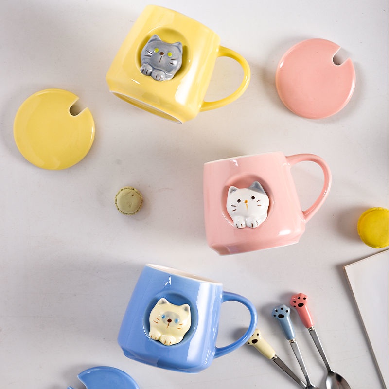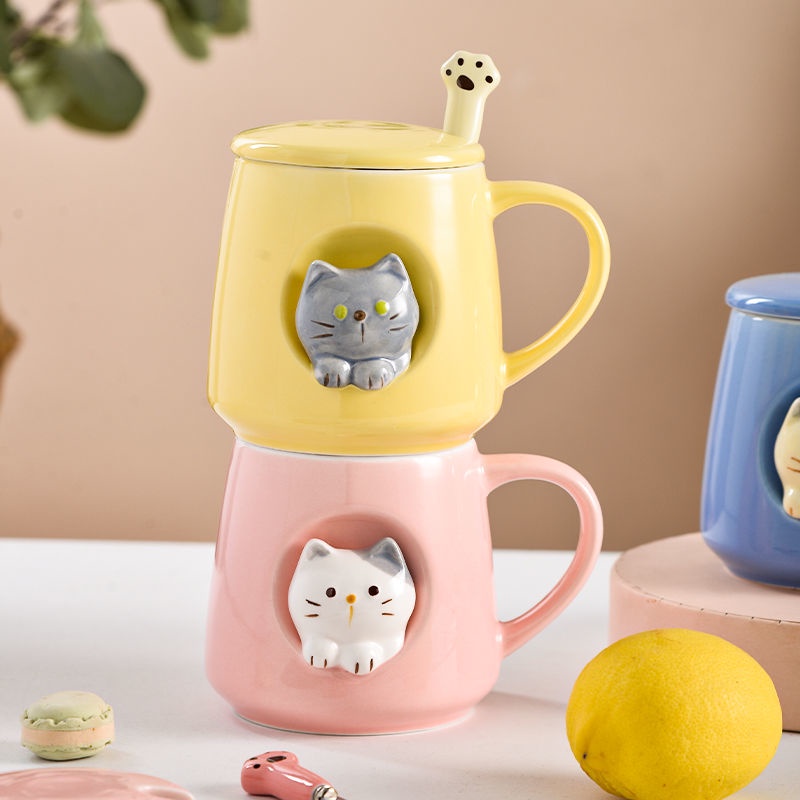 3D Cat Cup Ins Creative High-value Korean Mug with Cover Cute Cat Cup Ceramic Cup Mug with Spoon Birthday Gift CNY Gift Valentine's Day Gift