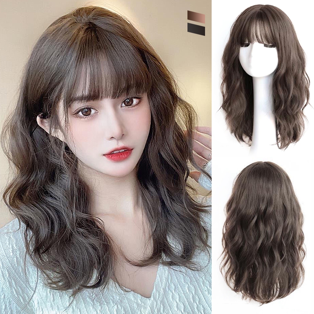 3d Wave Curl Full Hair Wig Air bangs Medium Length 45CM Full Coverage Natural Youth Styling Clavicle Hairwigs Free Gift Fake Hair Extension Rambut palsu perempuan
