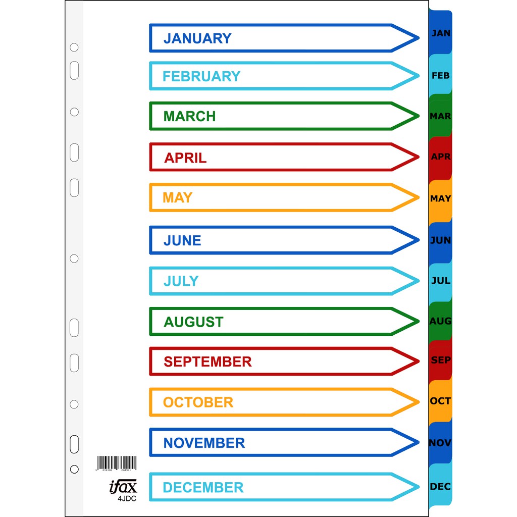 4JDC Bright Colour Plastic Dividers with Numbers Jan - Dec
