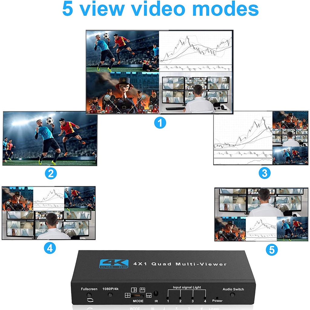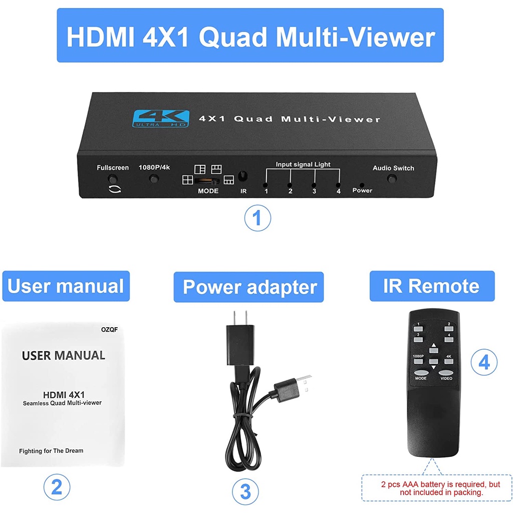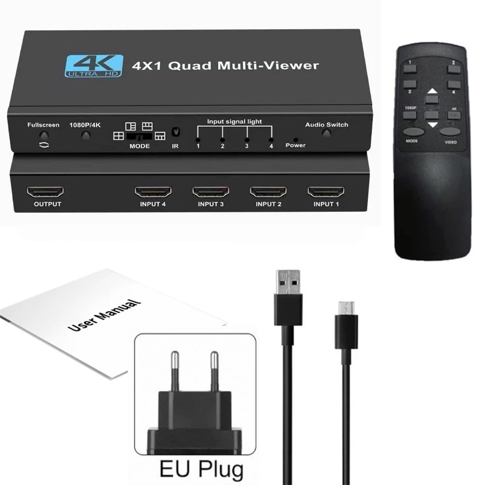 4K HDMI Quad Multi-Viewer 4x1 1080P HDMI 4 Screen Multiviewer Seamless Switcher 4 In 1 Out with Remote for Camera PC PS4 to HDTV