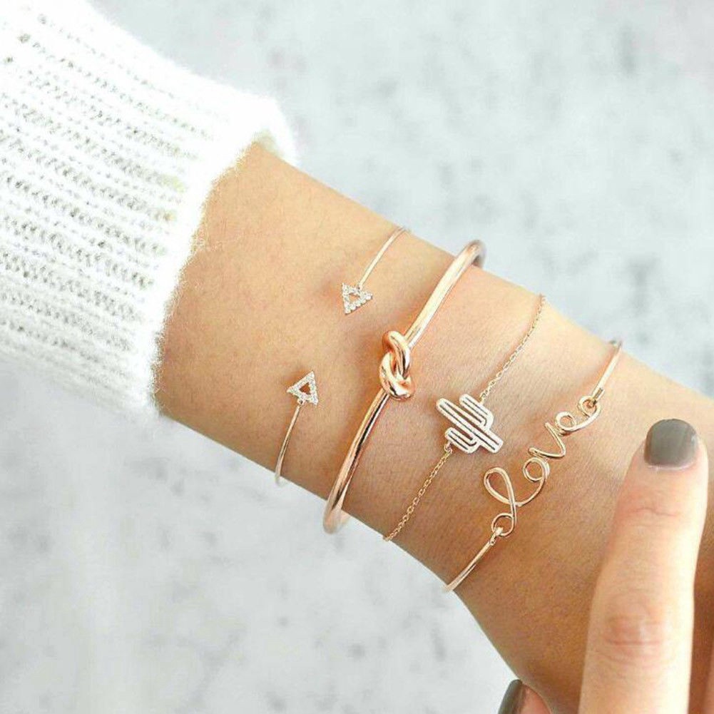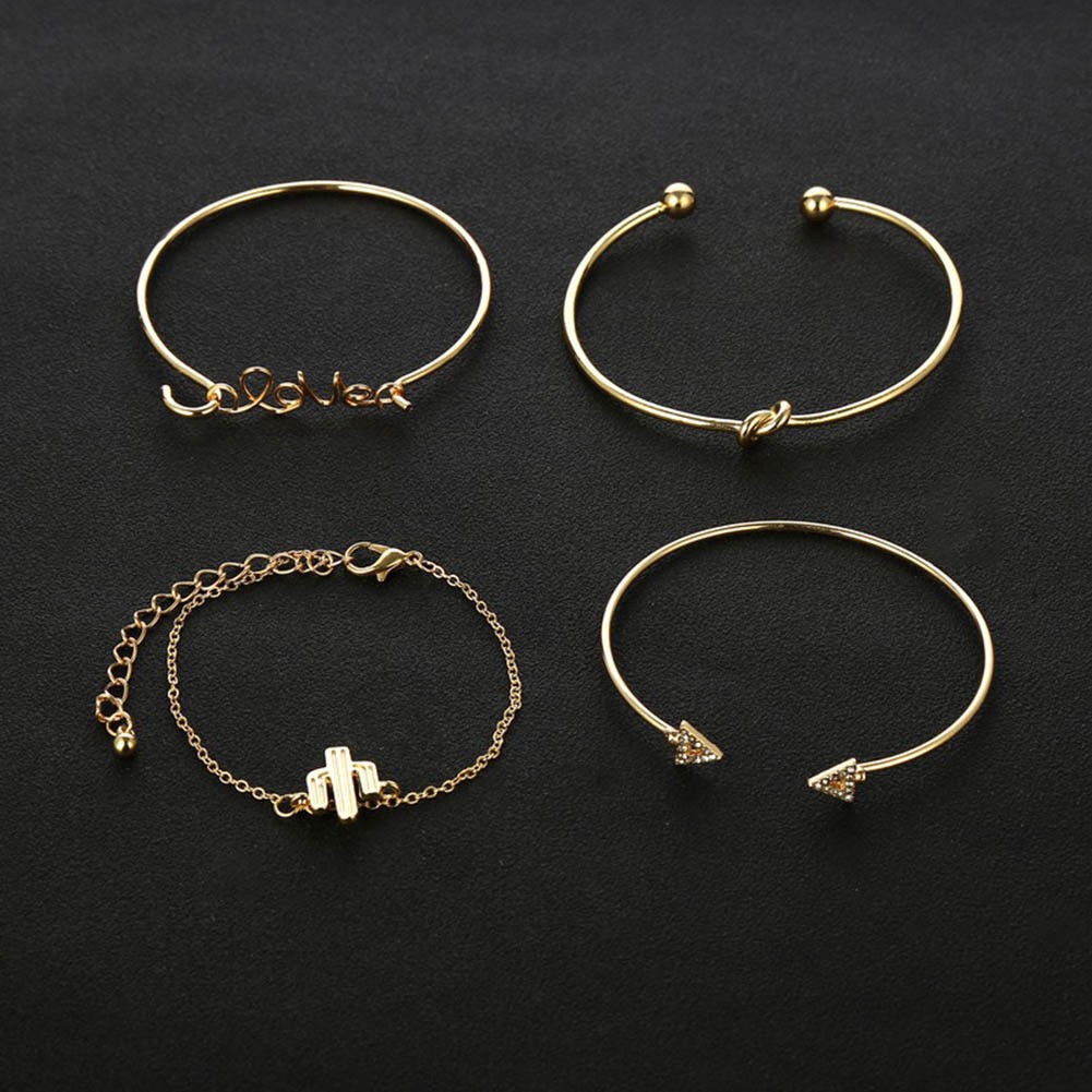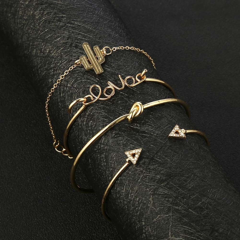 4Pcs/Set Women Gilr Gold Triangle Knot Love Cactus Opening Bangle Chain Bracelet