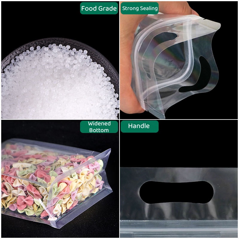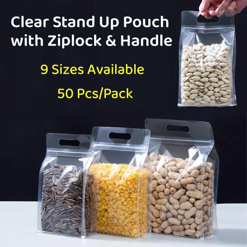 50pcs Clear Stand Up Bag with Ziplock Resealable Flat Bottom Side Gusset Plastic Bag with Handle for Freezer Organizer