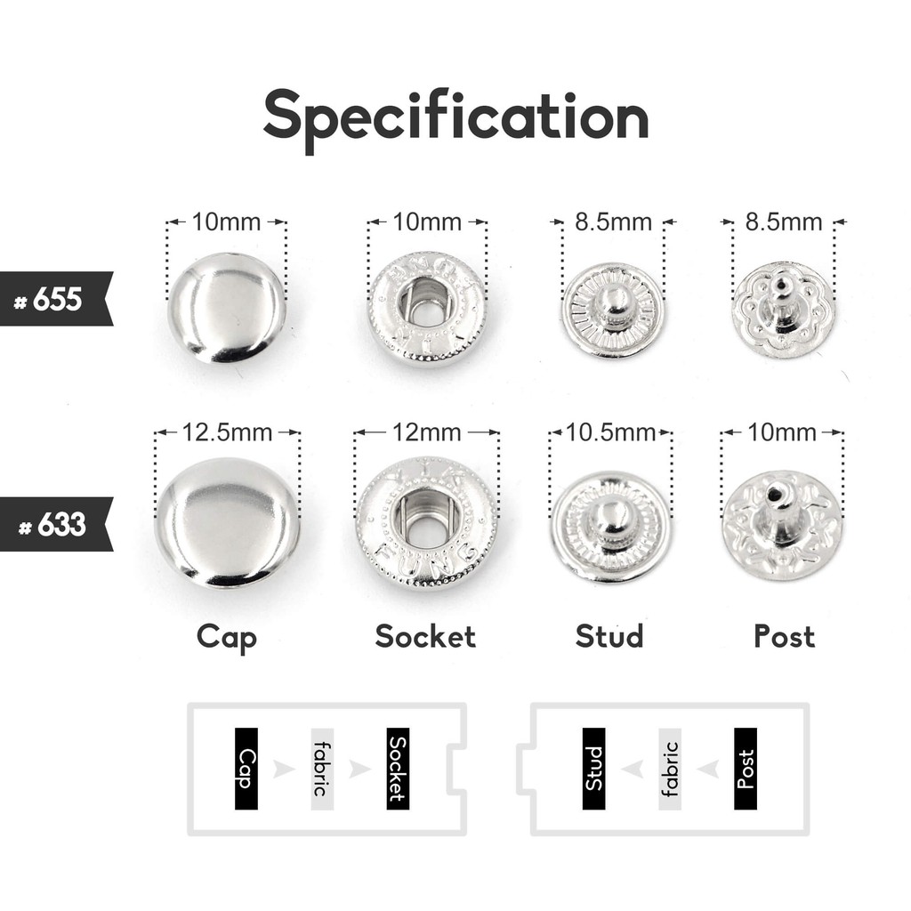 50sets Multi-Size/Color Metal Snap Fasteners Press Studs Snaps Button Sewing Accessories 10mm #655, 12.5mm #633, 15mm #831