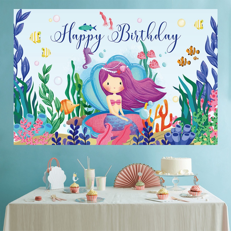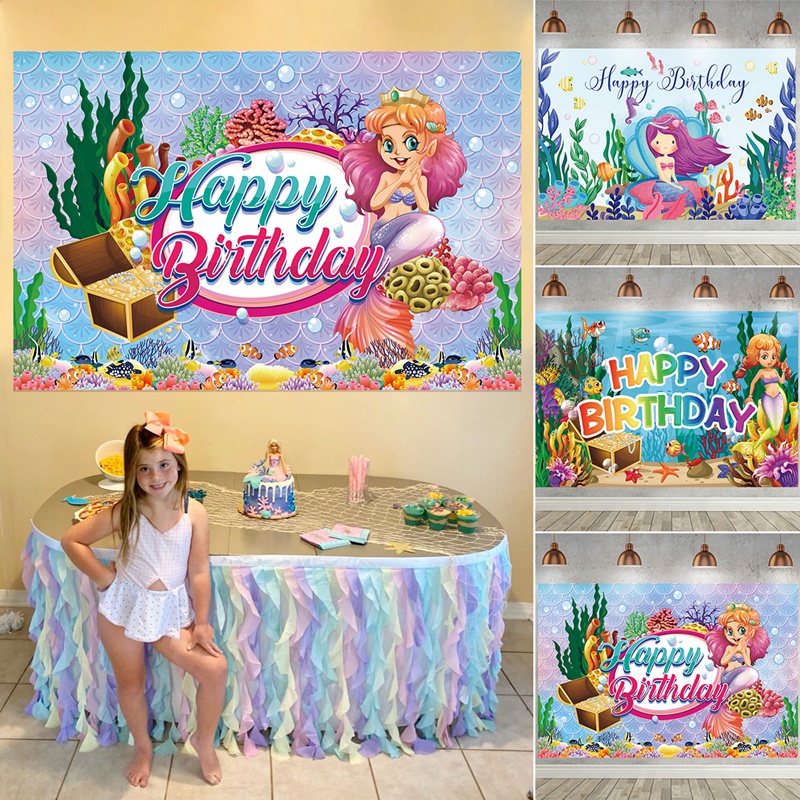 59.06*39.37 Cartoon Ariel The Little Mermaid Theme Happy birthday Background Underwater World Develop Curiosity For Little Girl Boy Birthaday Decoration Princess Birthday Banner