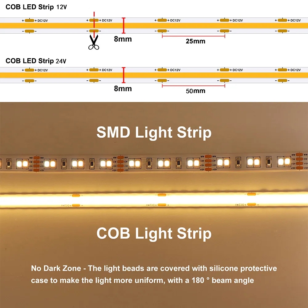 COB LED Strip High Density Flexible Diode 3000K 4000K 6000K 12V 24V Linear Dimmable Tape Decorative Lighting