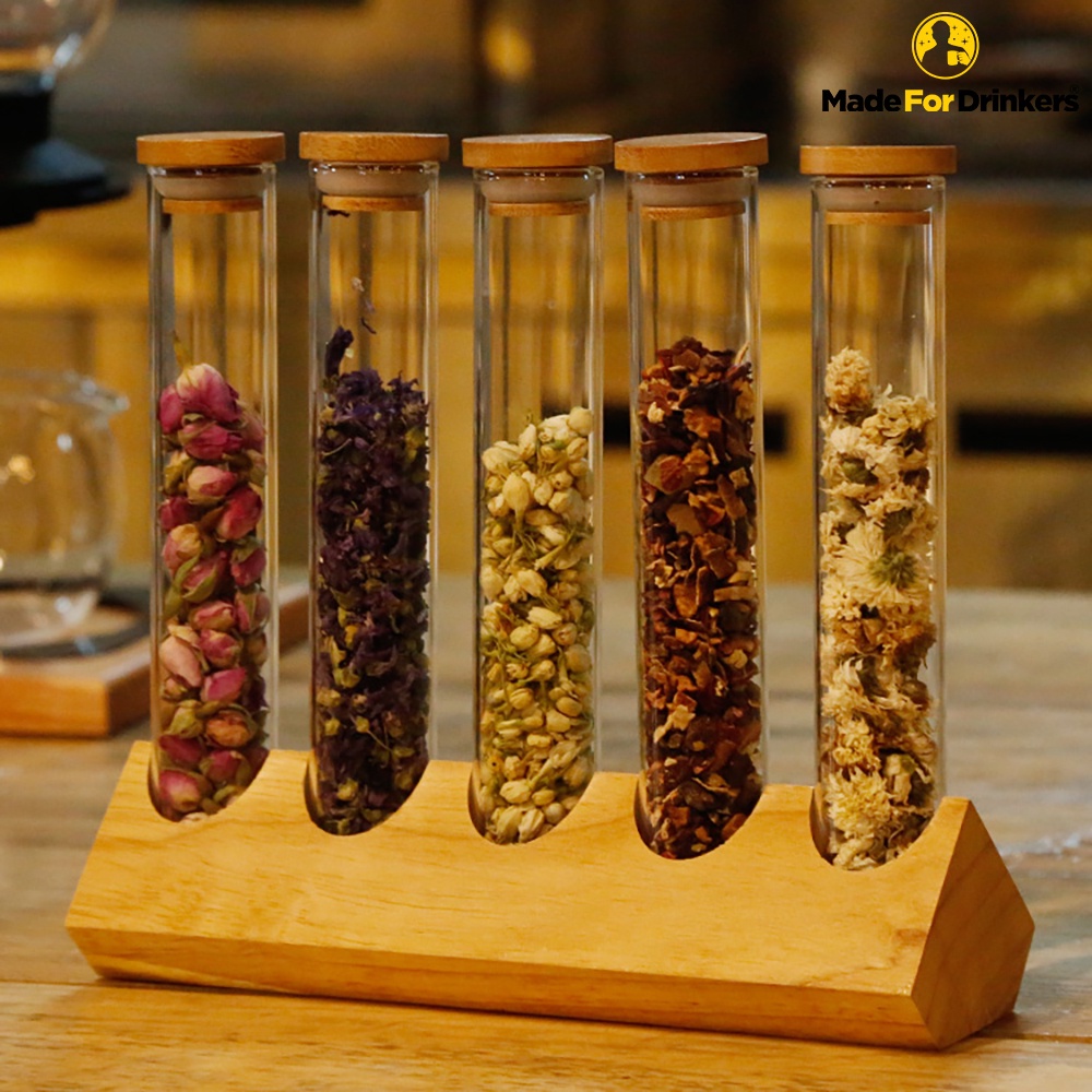 5pcs Glass Test Tube with Solid Wood Rack / coffeeware / good for Coffee Beans Tea Spice Glass Storage Bottle for Bar