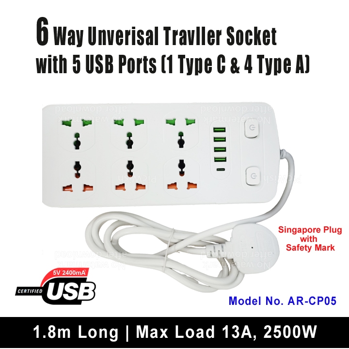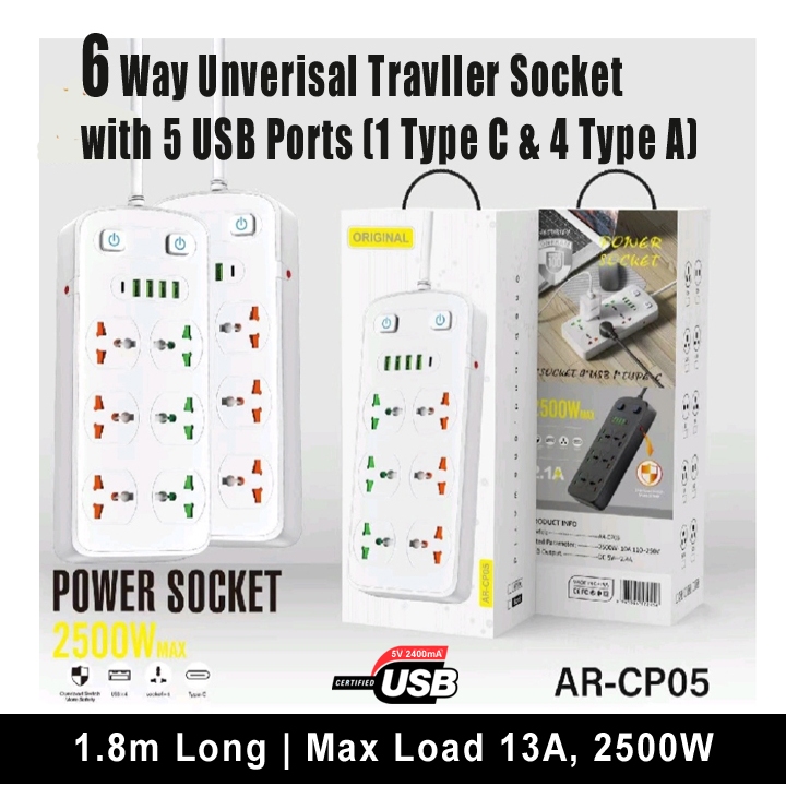 6 Way Universal Extension Travel Socket with 5 USB Ports 2.4A (1 Type C & 4 Type A USB Ports)