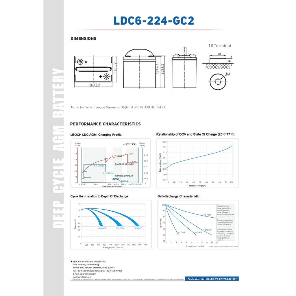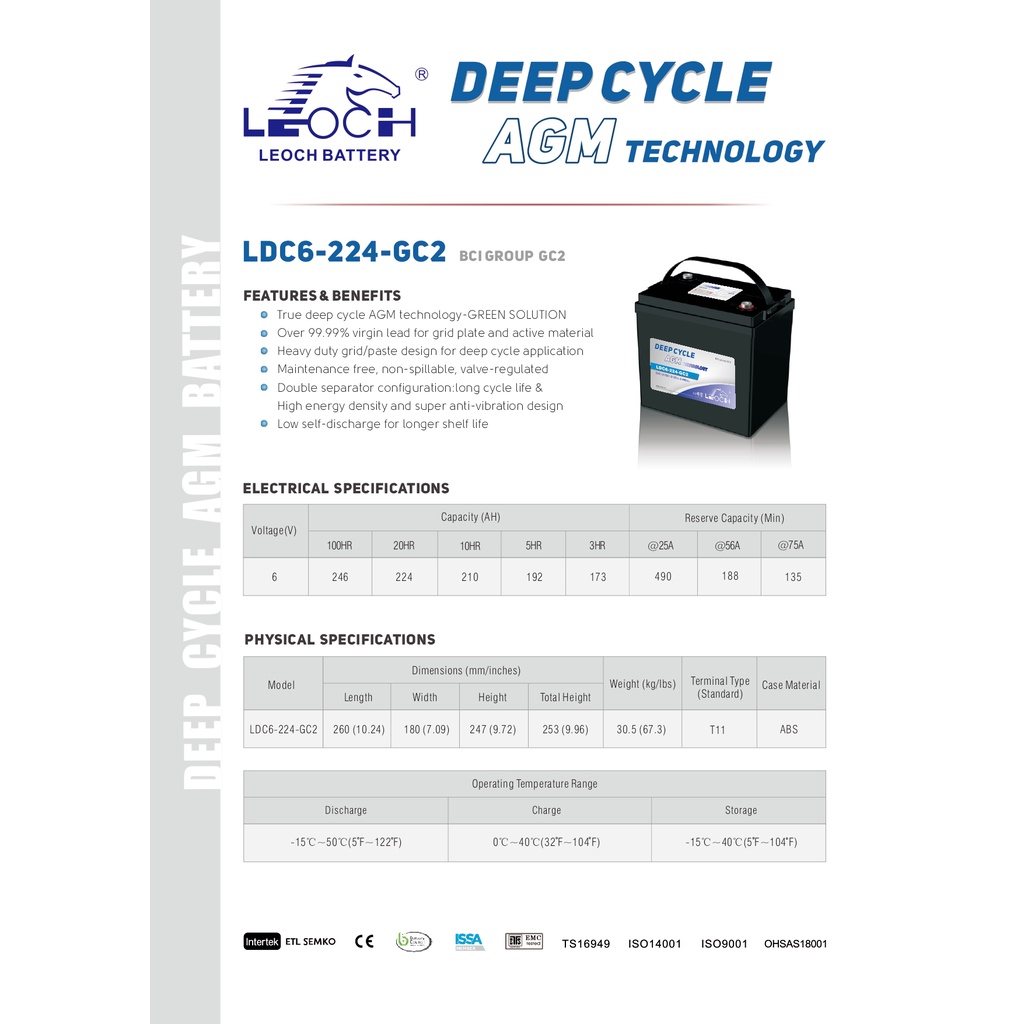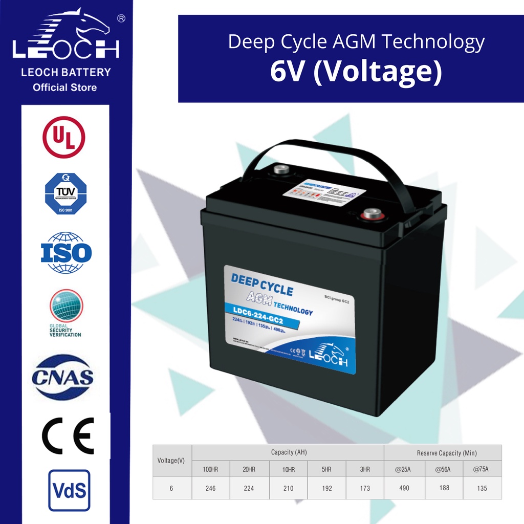 6V Leoch Deep Cycle AGM Technology Battery LDC6-224-GC2 for Golf Car / e-mobility / Boom Lift / Scissor lift
