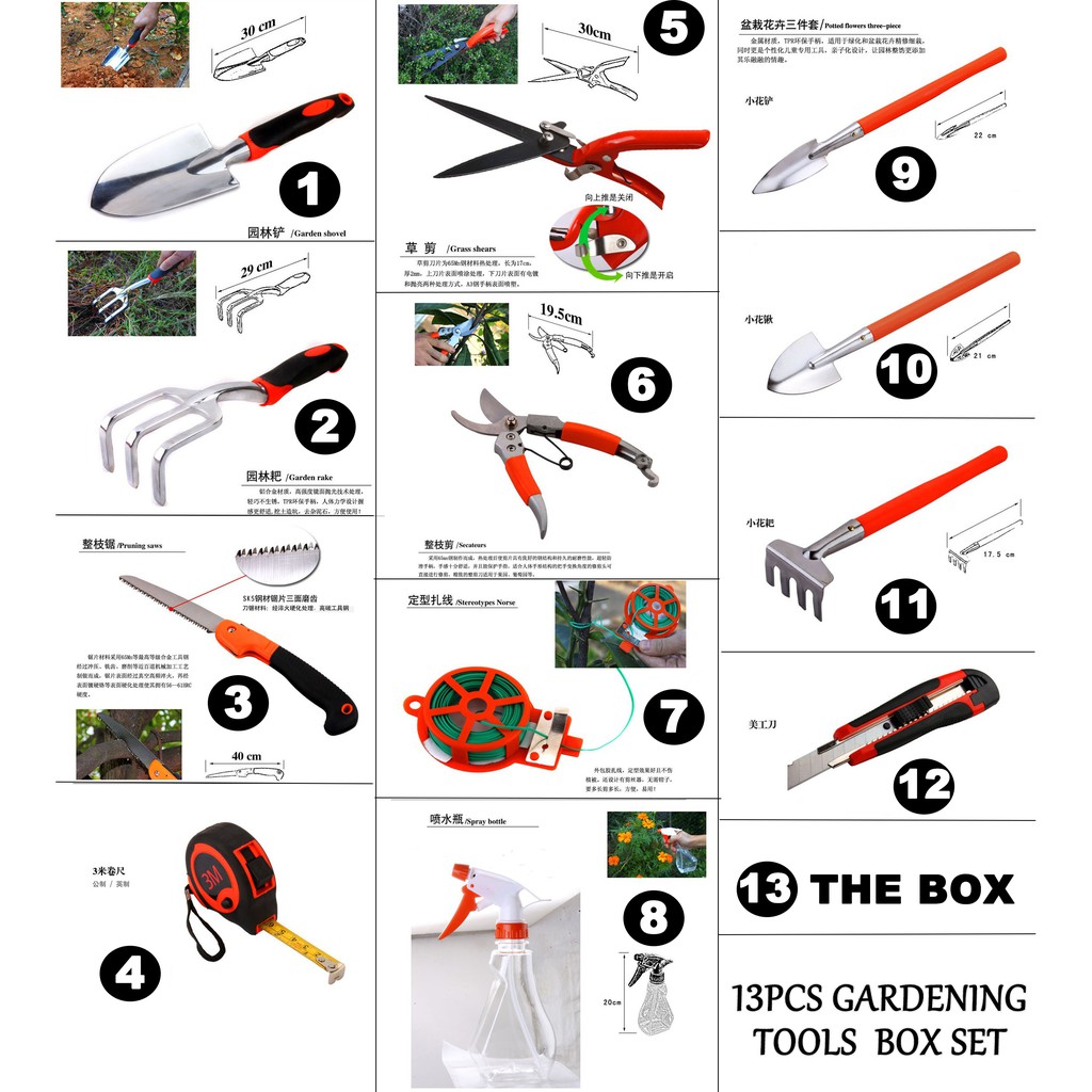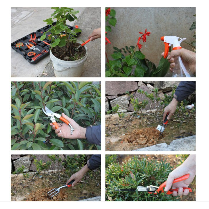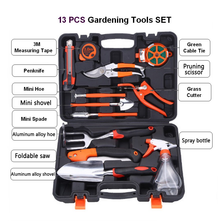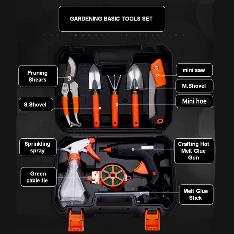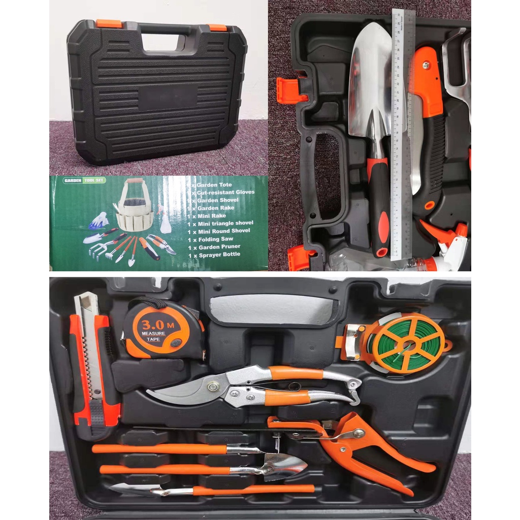 9/10/15Pcs Multi-use Gardening Garden Tools Box Set w Spade /Scissors/Shovel/Hoe/Cutter/Knife/ Measuring Tape/Saw/Shears