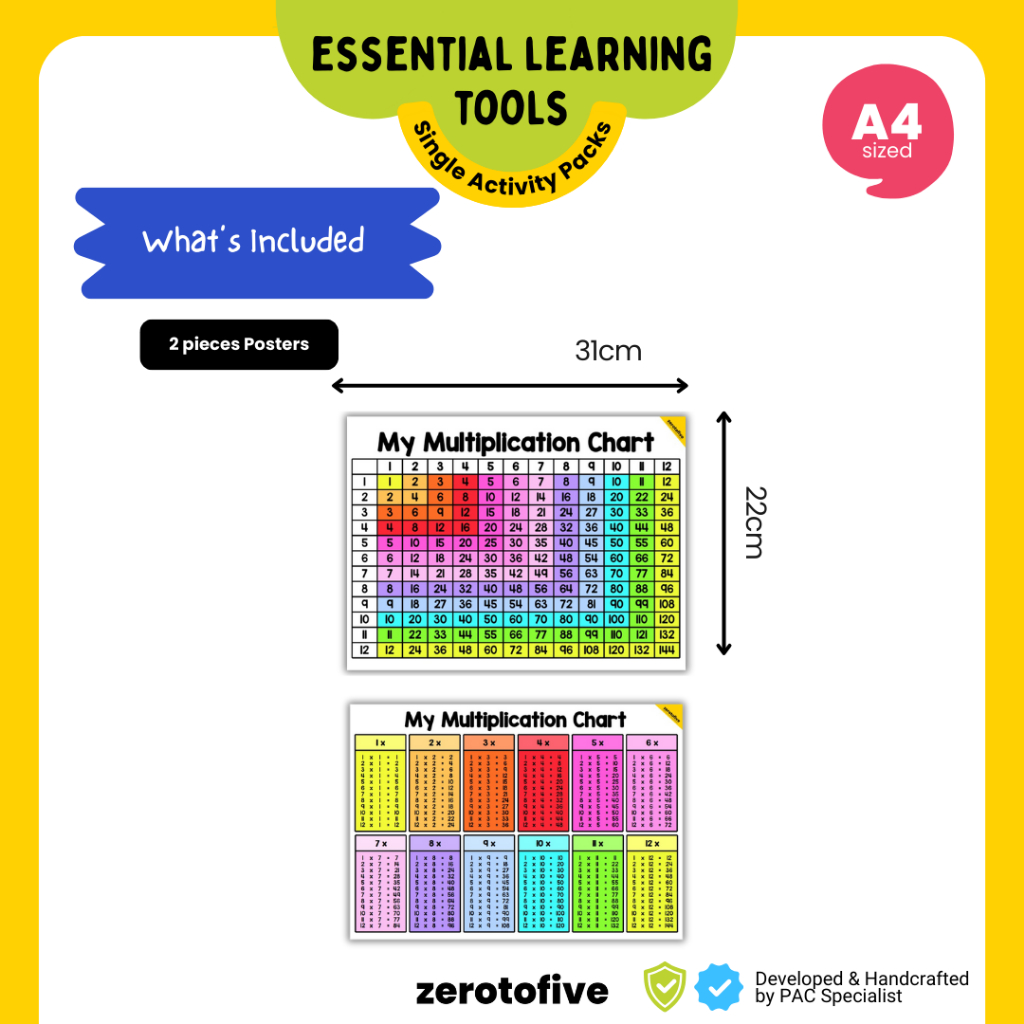 [zerotofive] A4 Poster Multiplication Table Times Sifir 1-12 Tambah Tolak Darab 123 ABC Belajar