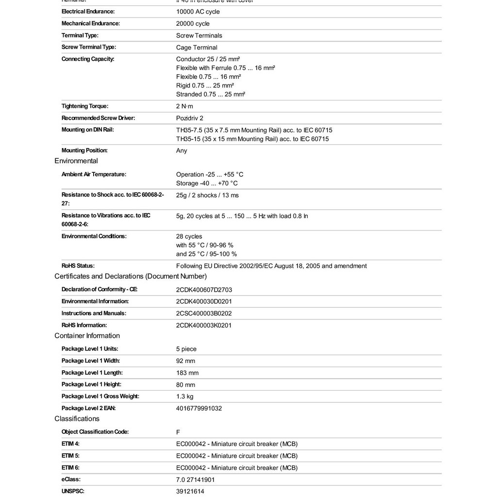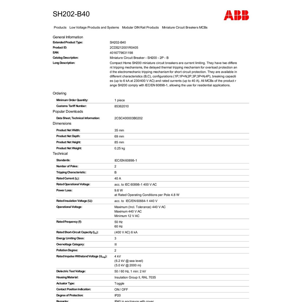 (SG Stock) ABB MCB (SH202-B40) 6kA B Curve 40A 2Pole Miniature Circuit Breaker