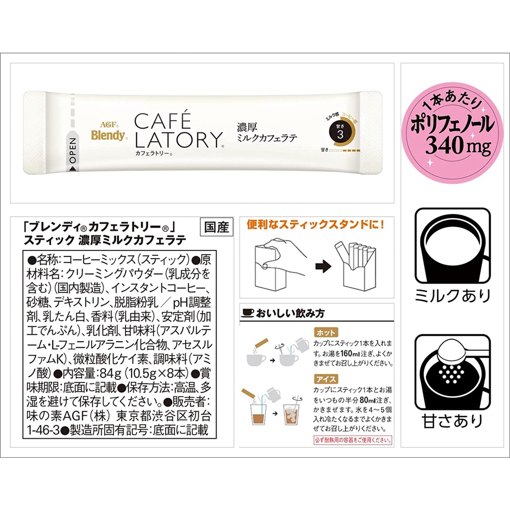 AGF Blendy Cafe Latory Stick Rich Milk Cafe Latte 8P [Stick Coffee] (Made in Japan) (Direct from Japan)
