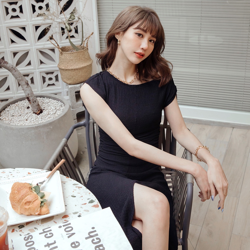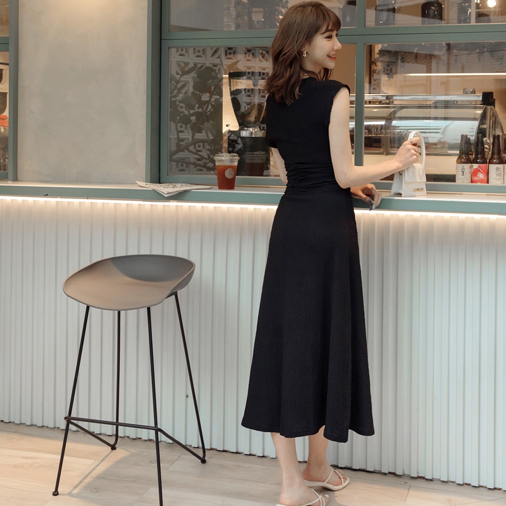 AIR SPACE LADY Slanted Shoulder Waist Scratch Slit Long Dress (Black/Khaki) Women's Clothing