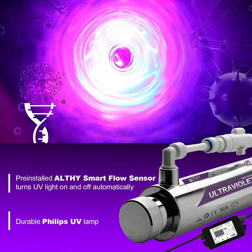 ALTHY UV Water Sterilizer System UV Tube Lamp Ultraviolet Light Purifier Disinfection Filter +Smart Flow Control Switch , Stainless Steel, 1GPM For Drinking Water