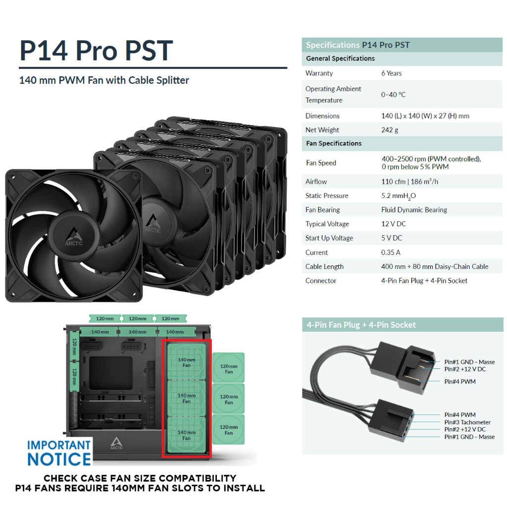 ARCTIC P12 Pro PST - 5 Pack P14 Pro PST - 5 Pack 120/140mm Computer Case Radiator Fan Daisy Chain