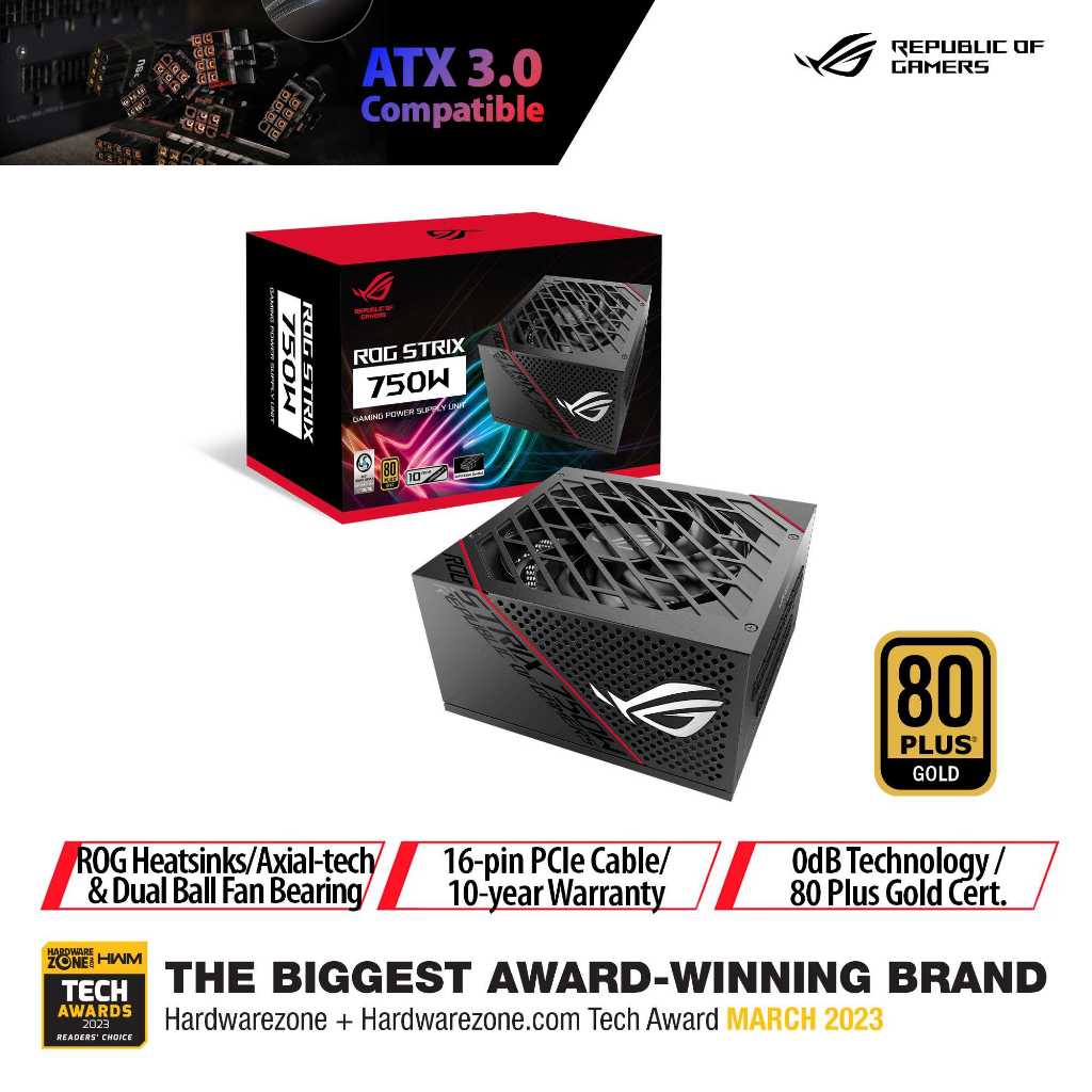 ASUS ROG Strix 750W Gold Full Modular PSU Power Supply - ROG heatsinks, Axial-tech fan design, dual ball fan bearings