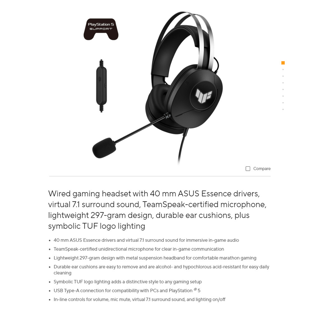 ASUS TUF Gaming H1 Gen II Wired Headset - 40mm ASUS Essence drivers, Virtual 7.1 Surround Sound, TeamSpeak-Certified Mic