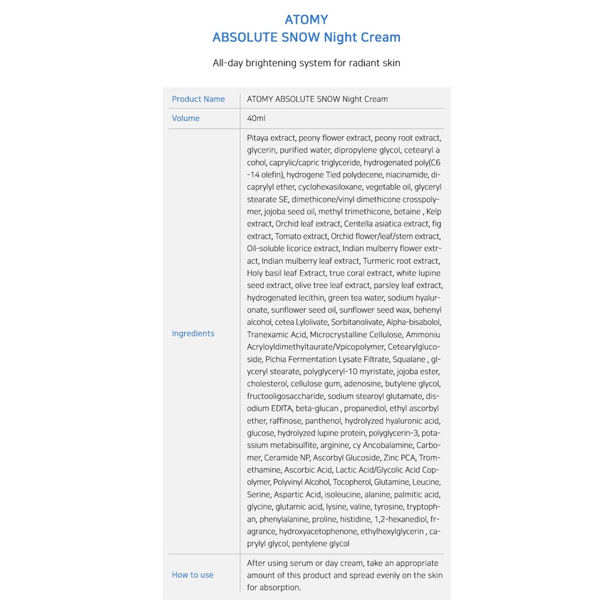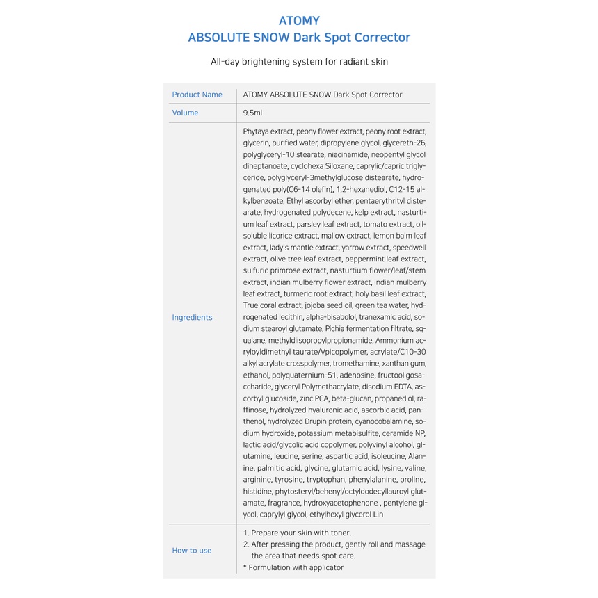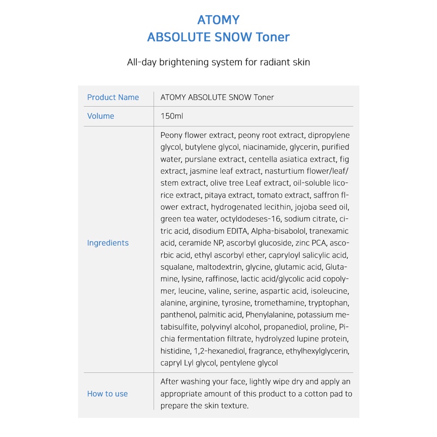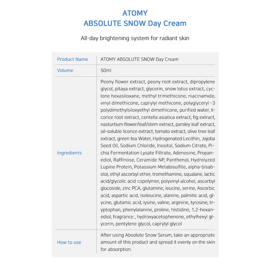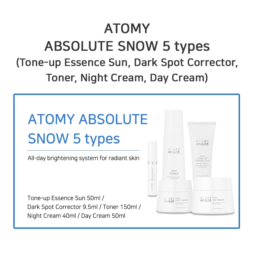 ATOMY ABSOLUTE SNOW Line(Tone-up Essence Sun, Dark Spot Corrector, Toner, Night Cream, Day Cream)