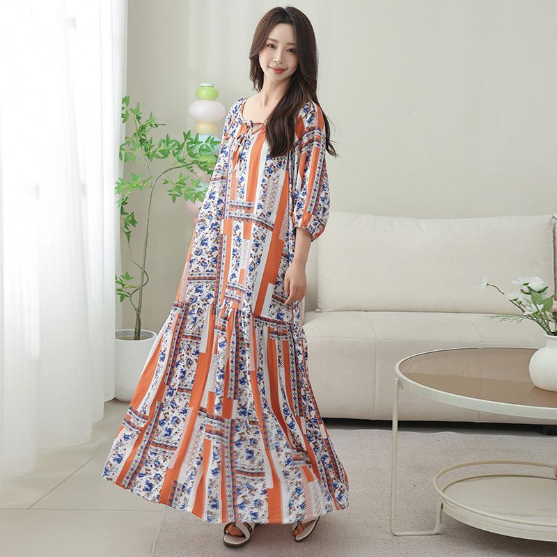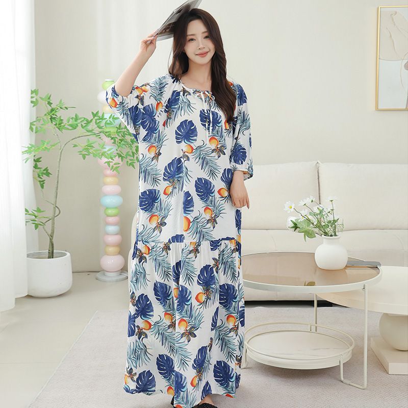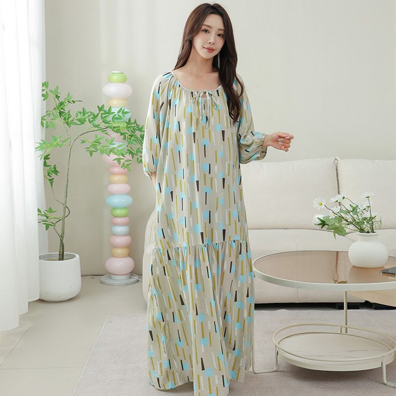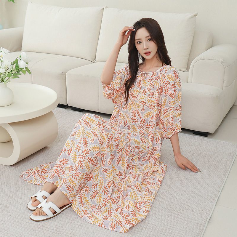 Nightdress with Pocket Women's Mid-Sleeved Tencel Cotton Vacation Beach Lazy Style Round Neck New Chinese Style to Ankle Long Skirt 4.12