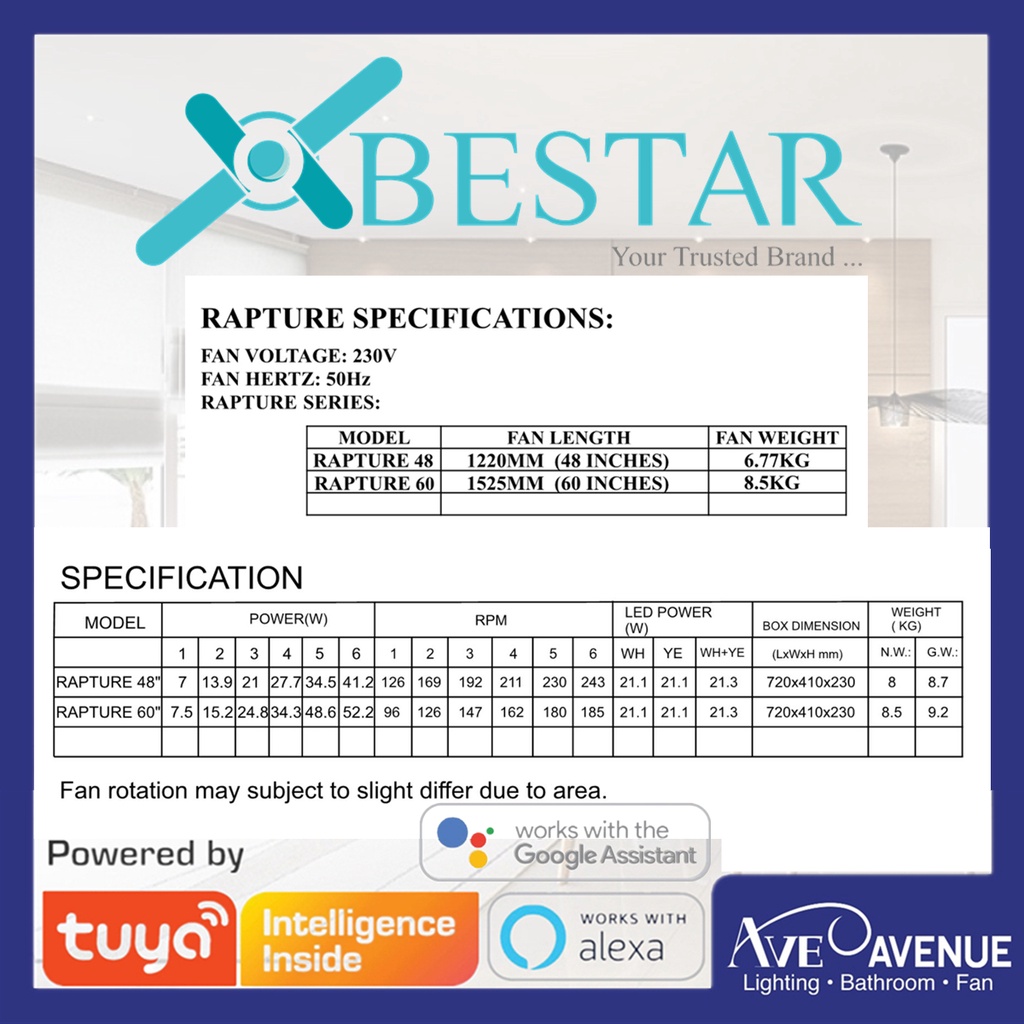 BESTAR RAPTURE 5Blade Smart WiFi DC Motor Ceiling Fan 48/60 Inch w 3-Tone LED Light n Remote Control