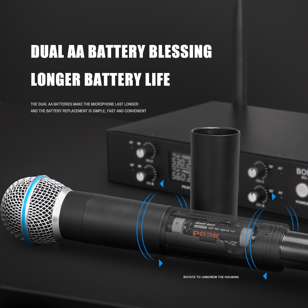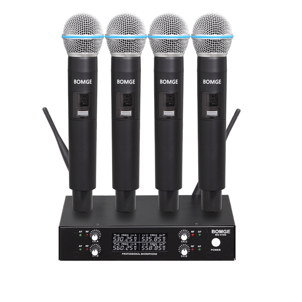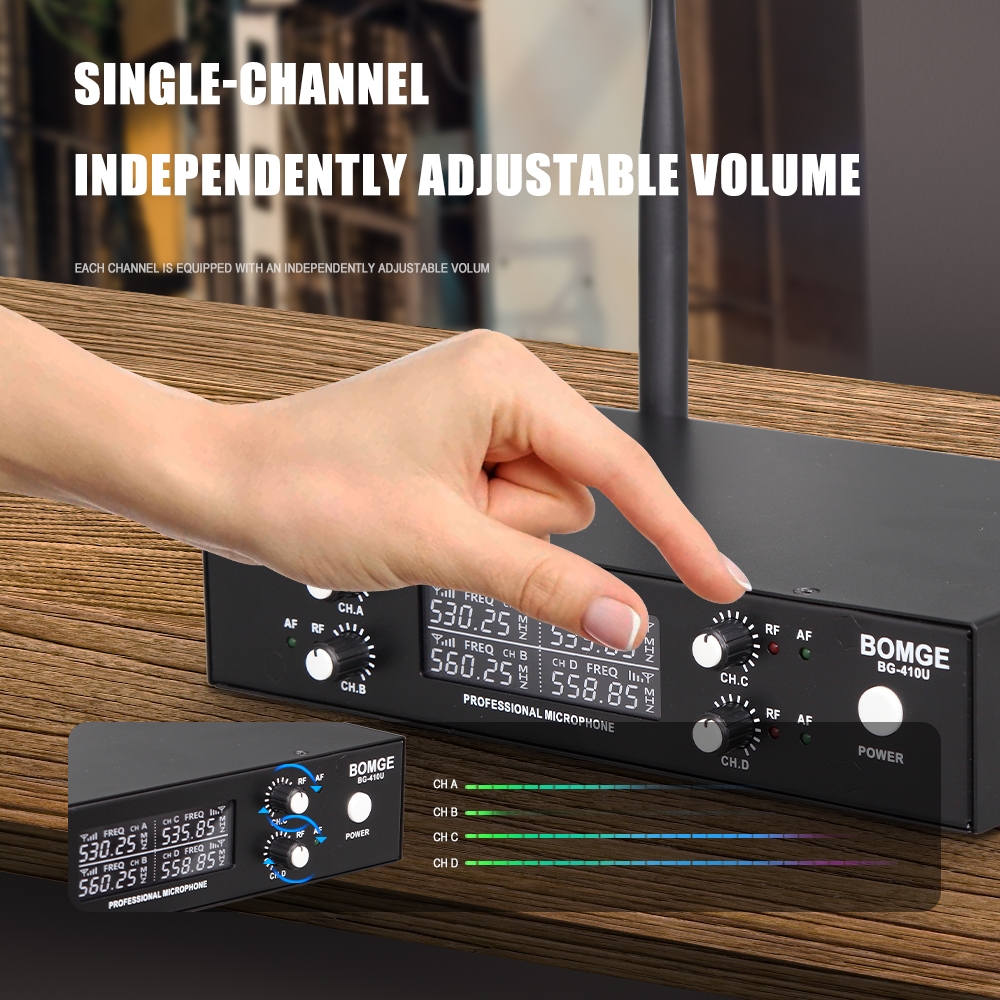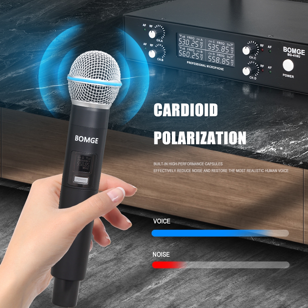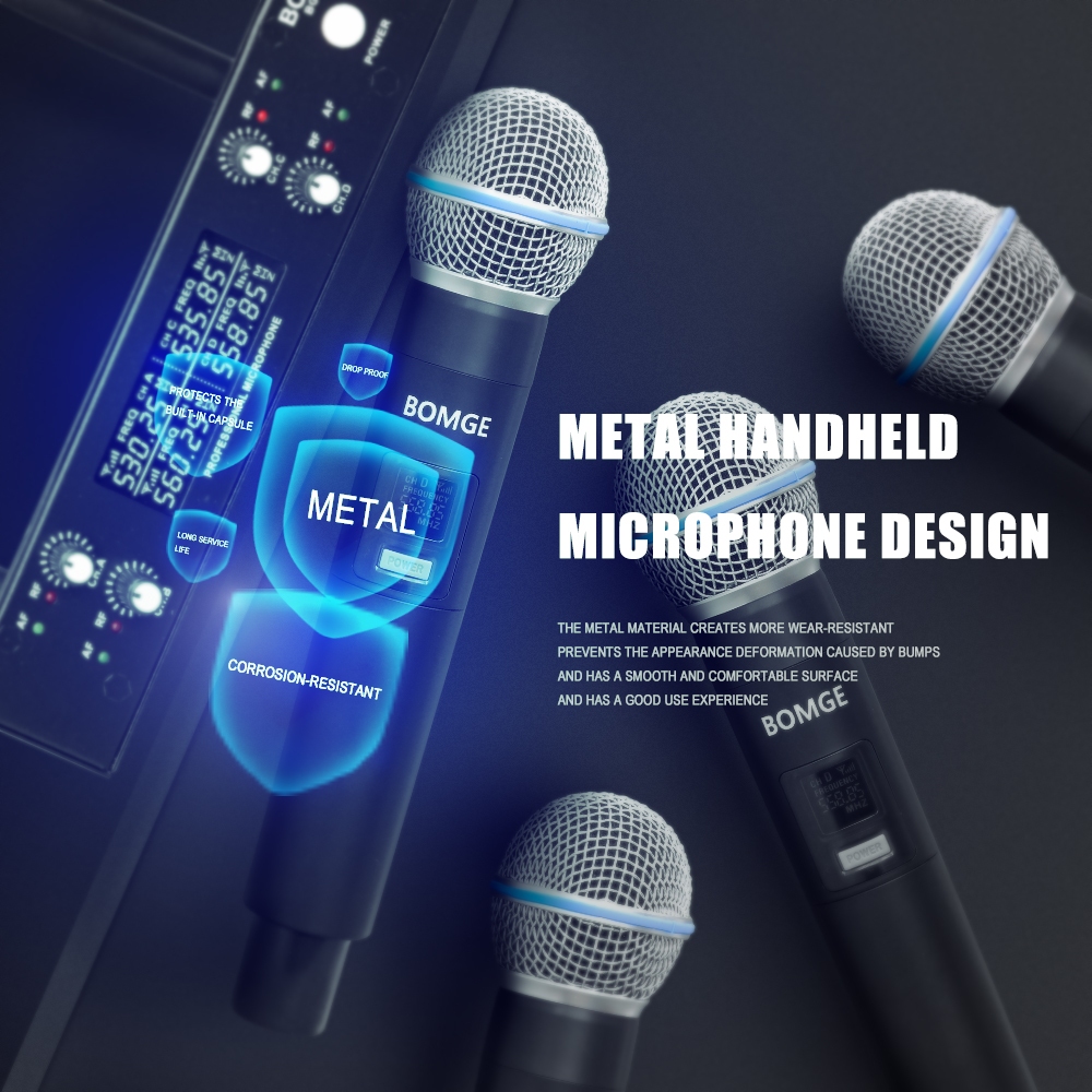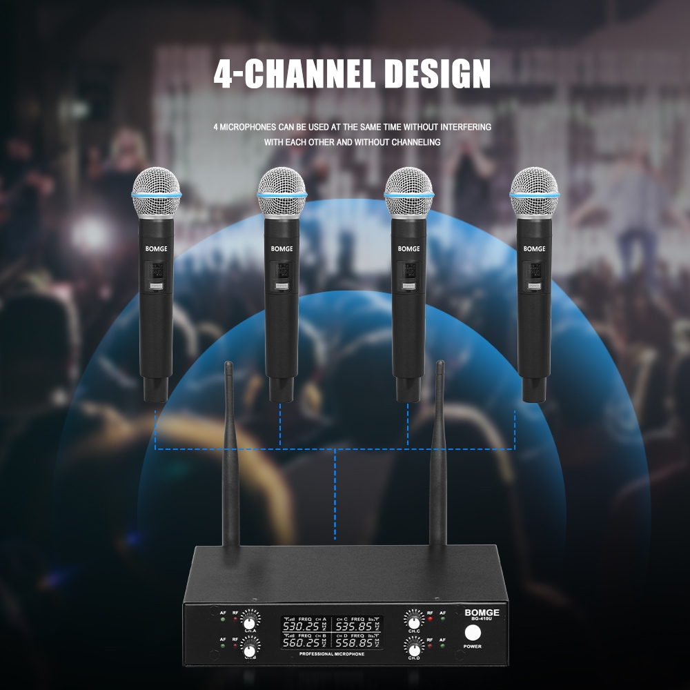 BOMGE Pro Wireless Microphone System, 4-Channel UHF Wireless Mic, Fixed Frequency Cordless Mic with 4 Handheld Dynamic Microphones, 260ft Range, Microphone for Singing,Church,Kara